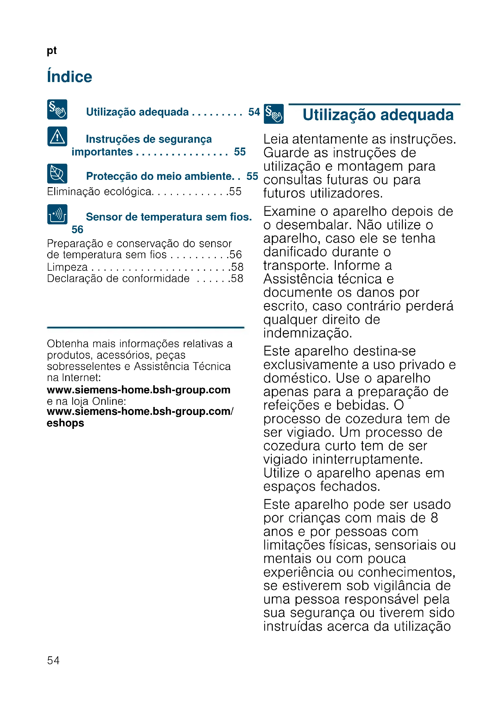 Preparação e conservação do sensor de temperatura sem fios . . . . . . . . . .56 Limpeza . . . . . . . . . . . . . . . . . . . . . . .58 Declaração de conformidade . . . . . .58 Produktinfo Obtenha mais informações relativas a produtos, acessórios, peças sobresselentes e Assistência Técnica na Internet: www.siemens-home.bsh-group.com e na loja Online: www.siemens-home.bsh-group.com/ eshops 8 Utilização adequada Utilização adequada Leia atentamente as instruções. Guarde as instruções de utilização e montagem para consultas futuras ou para futuros utilizadores. Examine o aparelho depois de o desembalar. Não utilize o aparelho, caso ele se tenha danificado durante o transporte. Informe a Assistência técnica e documente os danos por escrito, caso contrário perderá qualquer direito de indemnização. Este aparelho destina-se exclusivamente a uso privado e doméstico. Use o aparelho apenas para a preparação de refeições e bebidas. O processo de cozedura tem de ser vigiado. Um processo de cozedura curto tem de ser vigiado ininterruptamente. Utilize o aparelho apenas em espaços fechados. Este aparelho pode ser usado por crianças com mais de 8 anos e por pessoas com limitações físicas, sensoriais ou mentais ou com pouca experiência ou conhecimentos, se estiverem sob vigilância de uma pessoa responsável pela sua segurança ou tiverem sido instruídas acerca da utilizaçãopt
