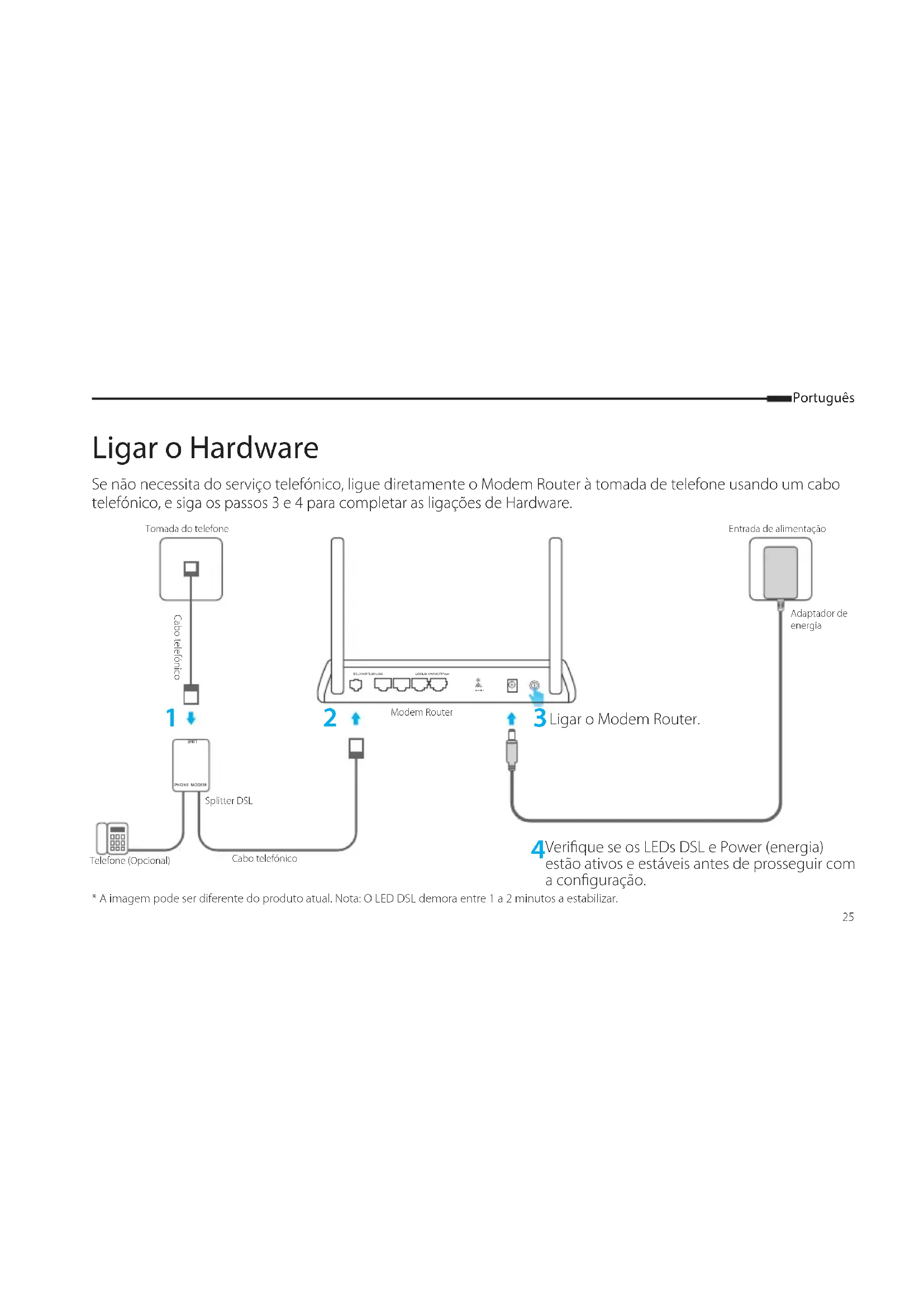 Ligar o Hardware Se não necessita do serviço telefónico, ligue diretamente o Modem Router à tomada de telefone usando um cabo telefónico, e siga os passos 3 e 4 para completar as ligações de Hardware. PHONE LINE MODEM