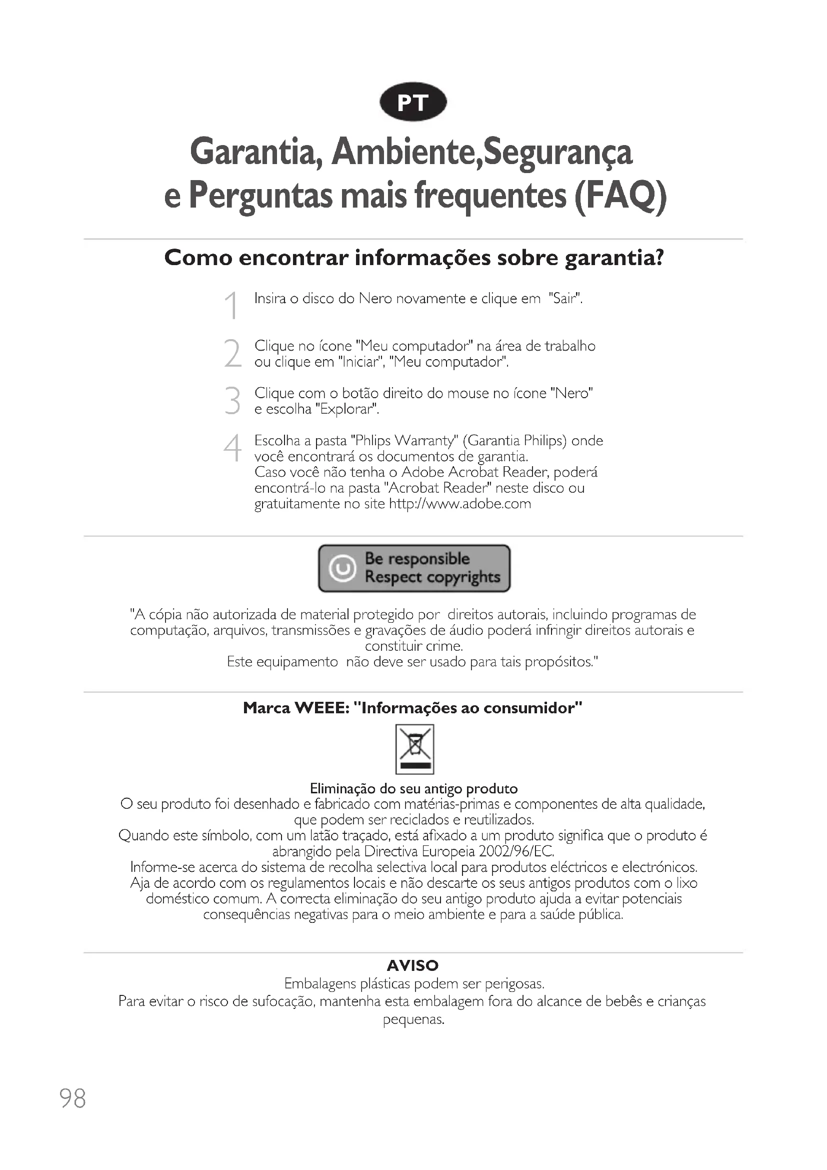 Escolha a pasta "Phlips Warranty" (Garantia Philips) onde você encontrará os documentos de garantia. Caso você não tenha o Adobe Acrobat Reader, poderá encontrá-lo na pasta "Acrobat Reader" neste disco ou gratuitamente no site http://www.adobe.com "A cópia não autorizada de material protegido por direitos autorais, incluindo programas de computação, arquivos, transmissões e gravações de áudio poderá infringir direitos autorais e constituir crime. Este equipamento não deve ser usado para tais propósitos." Marca WEEE: "Informações ao consumidor" Eliminação do seu antigo produto O seu produto foi desenhado e fabricado com matérias-primas e componentes de alta qualidade, que podem ser reciclados e reutilizados. Quando este símbolo, com um latão traçado, está afixado a um produto significa que o produto é abrangido pela Directiva Europeia 2002/96/EC. Informe-se acerca do sistema de recolha selectiva local para produtos eléctricos e electrónicos. Aja de acordo com os regulamentos locais e não descarte os seus antigos produtos com o lixo doméstico comum. A correcta eliminação do seu antigo produto ajuda a evitar potenciais consequências negativas para o meio ambiente e para a saúde pública. AVISO Embalagens plásticas podem ser perigosas. Para evitar o risco de sufocação, mantenha esta embalagem fora do alcance de bebês e crianças pequenas. Garantia, Ambiente,Segurança e Perguntas mais frequentes (FAQ) PT99 Perguntas mais frequentes (FAQ) Questão 1: Tenho um PC com o Windows 98 Second Edition e não tenho uma unidade de CD-ROM no computador mas tenho outro PC. Como posso instalar os controladores?