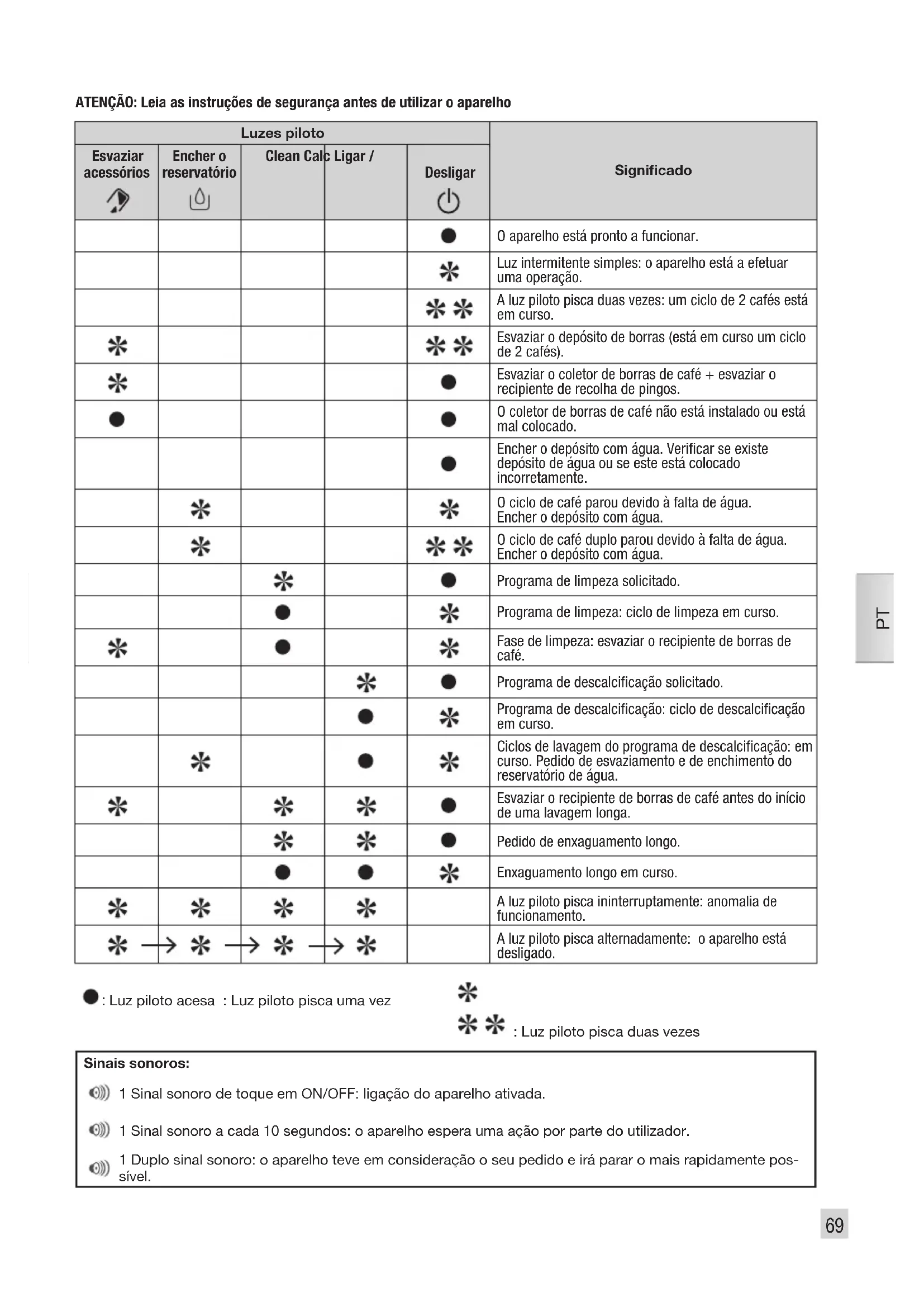 Perigo : Advertência contra riscos de ferimentos corporais graves ou mortais. O símbolo do raio indica perigos relacionados com a presença de eletricidade. Atenção : Advertência contra a eventual ocorrência de funcionamentos indevidos, danos ou destruição da máquina. Importante : Observação geral ou importante relativa ao funcionamento da máquina. Pictogramas e sinais de aviso Esvazie o coletor de borras de café e a gaveta de recolha de pingos: O indicador luminoso permanece ligado se o coletor de borras de café não for premido corretamente, ou se for colocado no lugar antes de passarem 4 segun- dos. Encher o depósito de água Regulação da nura de moagem dos grãos de café CLEAN Proceder à limpeza café standard café forte CALC Proceder à descalcicação Tecla de vapor CLEAN + CALC Proceder à lavagem longa Lavagem/manutenção71