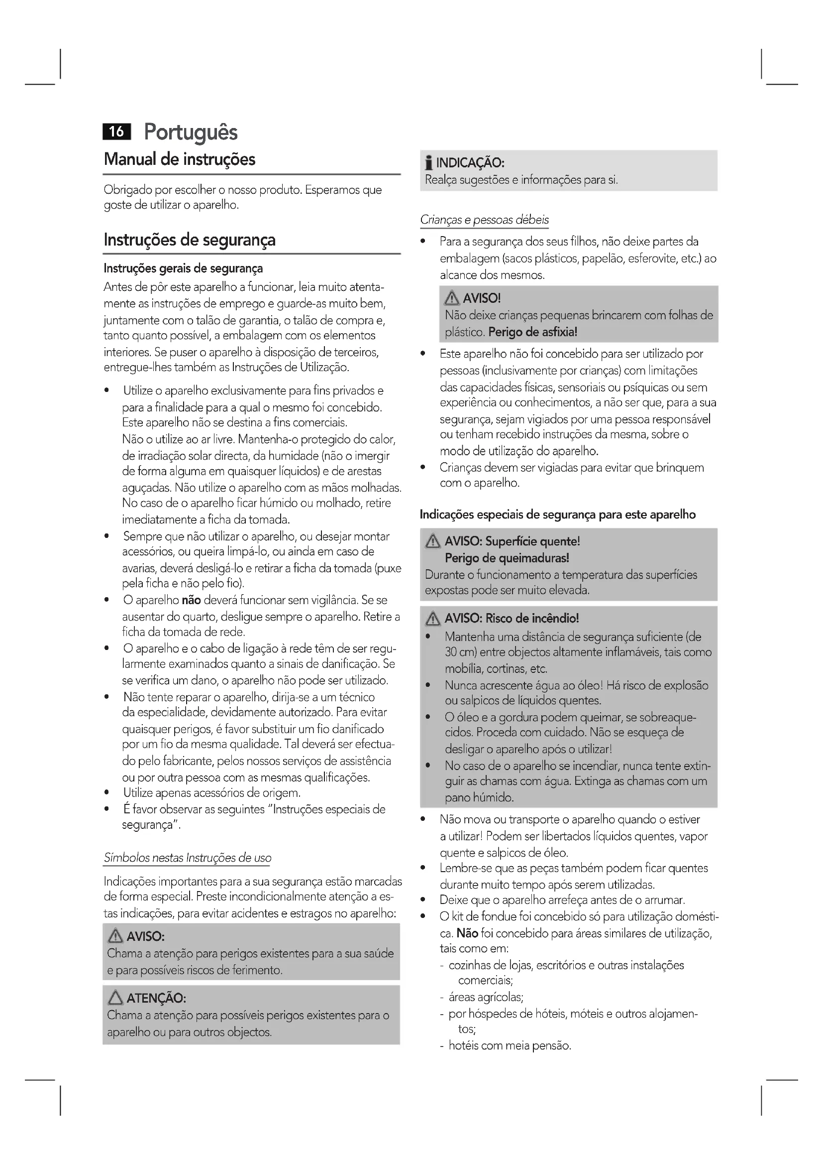 - Criançasdevemservigiadasparaevitarquebrinquem com o aparelho. Indicações especiais de segurança para este aparelho AVISO: Superfície quente! Perigo de queimaduras! Durante o funcionamento a temperatura das superfícies expostas pode ser muito elevada. AVISO: Risco de incêndio!