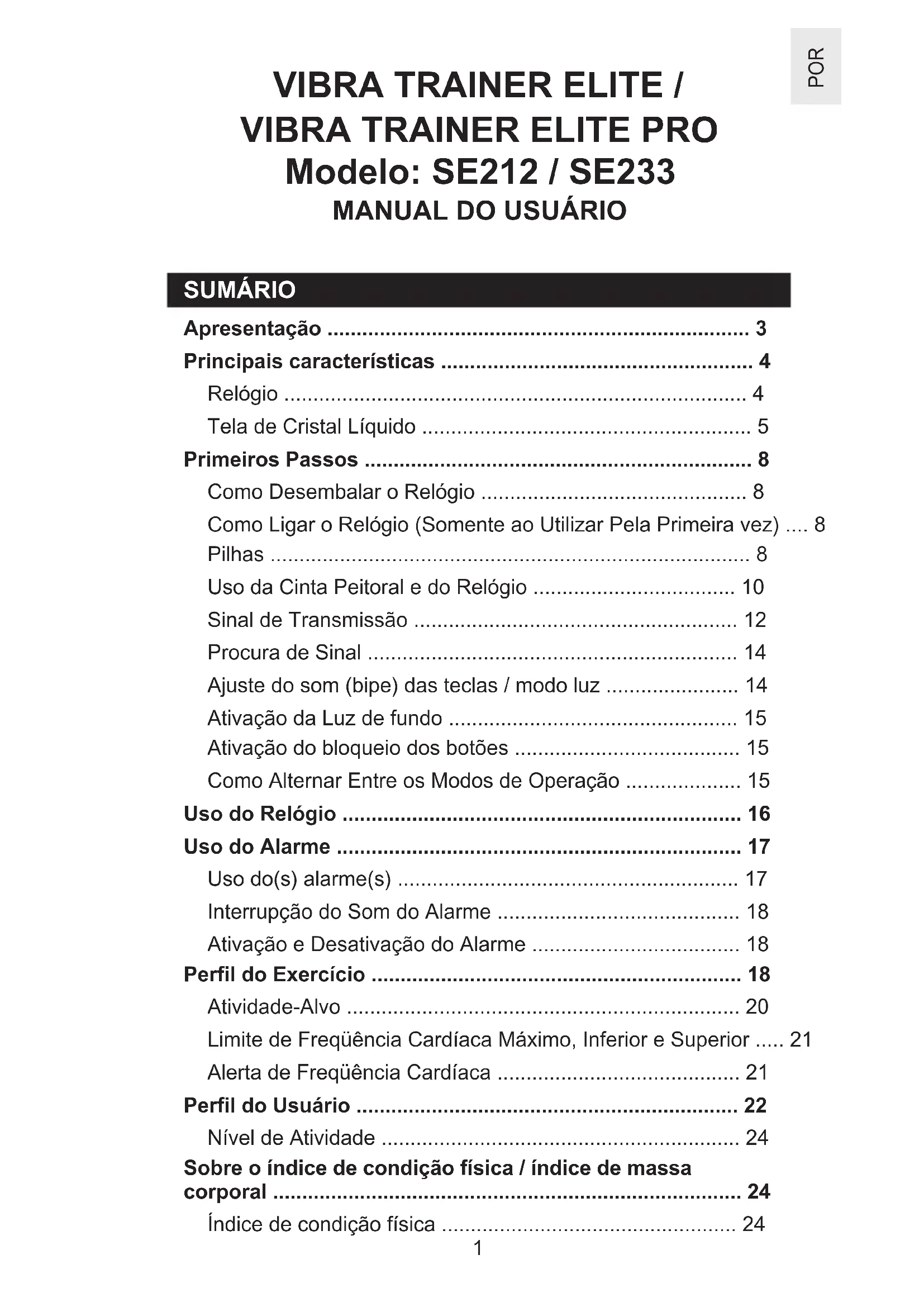 - POR Índice de massa corporal (somente modelo VIBRA Trainer Elite Pro) p. 25
