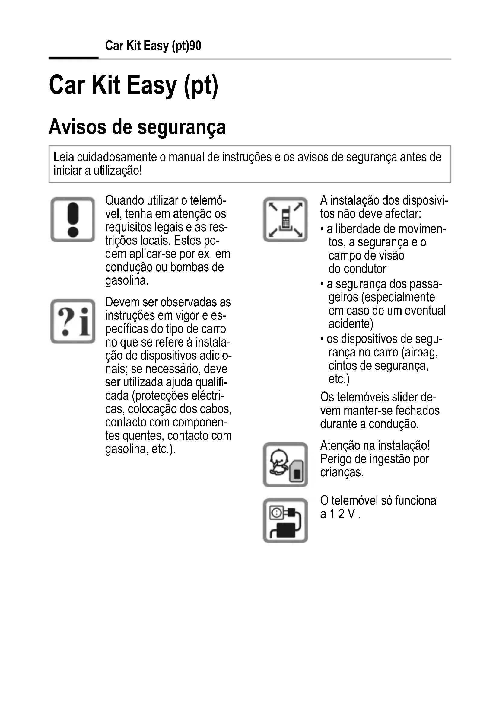 - Cuna soporte para reemplazar Productos disponibles en comercios especializados o en Internet en nuestra tienda online bajo: En países en los que nuestro producto no se vende a través de distribuidores autorizados los servicios de reparación y sustitución no están disponibles. Alimentación de tensión 10,8 V hasta 16 V Consumo eléctrico máx. 1 A / máx. 1 mA (corrien- te de reposo) Temperatura de funciona- miento –20 °C hasta +55 °C Potencia de salida de los altavoces máx. 1,3 W Siemens Original Accessories www.siemens- mobile.com/shopCar Kit Easy (pt)90 Car Kit Easy (pt) Avisos de segurança Leia cuidadosamente o manual de instruções e os avisos de segurança antes de iniciar a utilização! Quando utilizar o telemó- vel, tenha em atenção os requisitos legais e as res- trições locais. Estes po- dem aplicar-se por ex. em condução ou bombas de gasolina. Devem ser observadas as instruções em vigor e es- pecíficas do tipo de carro no que se refere à instala- ção de dispositivos adicio- nais; se necessário, deve ser utilizada ajuda qualifi- cada (protecções eléctri- cas, colocação dos cabos, contacto com componen- tes quentes, contacto com gasolina, etc.). A instalação dos disposivi- tos não deve afectar: