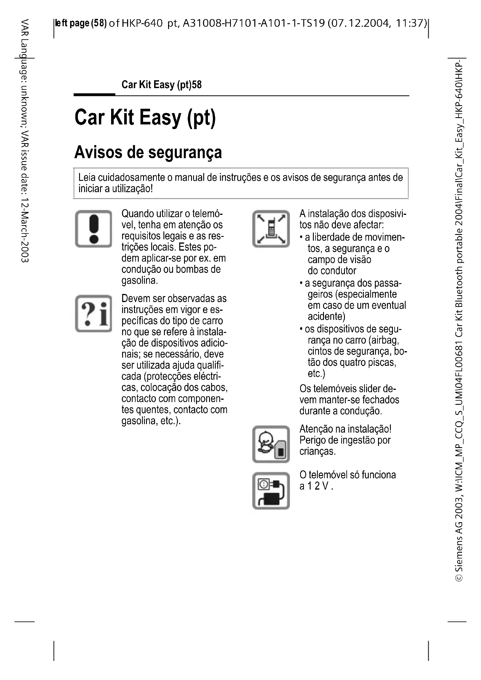 37) Car Kit Easy (pt)58 VAR Language: unknown; VAR issue date: 12-March-2003 Car Kit Easy (pt) Avisos de segurança Leia cuidadosamente o manual de instruções e os avisos de segurança antes de iniciar a utilização! Quando utilizar o telemó- vel, tenha em atenção os requisitos legais e as res- trições locais. Estes po- dem aplicar-se por ex. em condução ou bombas de gasolina. Devem ser observadas as instruções em vigor e es- pecíficas do tipo de carro no que se refere à instala- ção de dispositivos adicio- nais; se necessário, deve ser utilizada ajuda qualifi- cada (protecções eléctri- cas, colocação dos cabos, contacto com componen- tes quentes, contacto com gasolina, etc.). A instalação dos disposivi- tos não deve afectar: