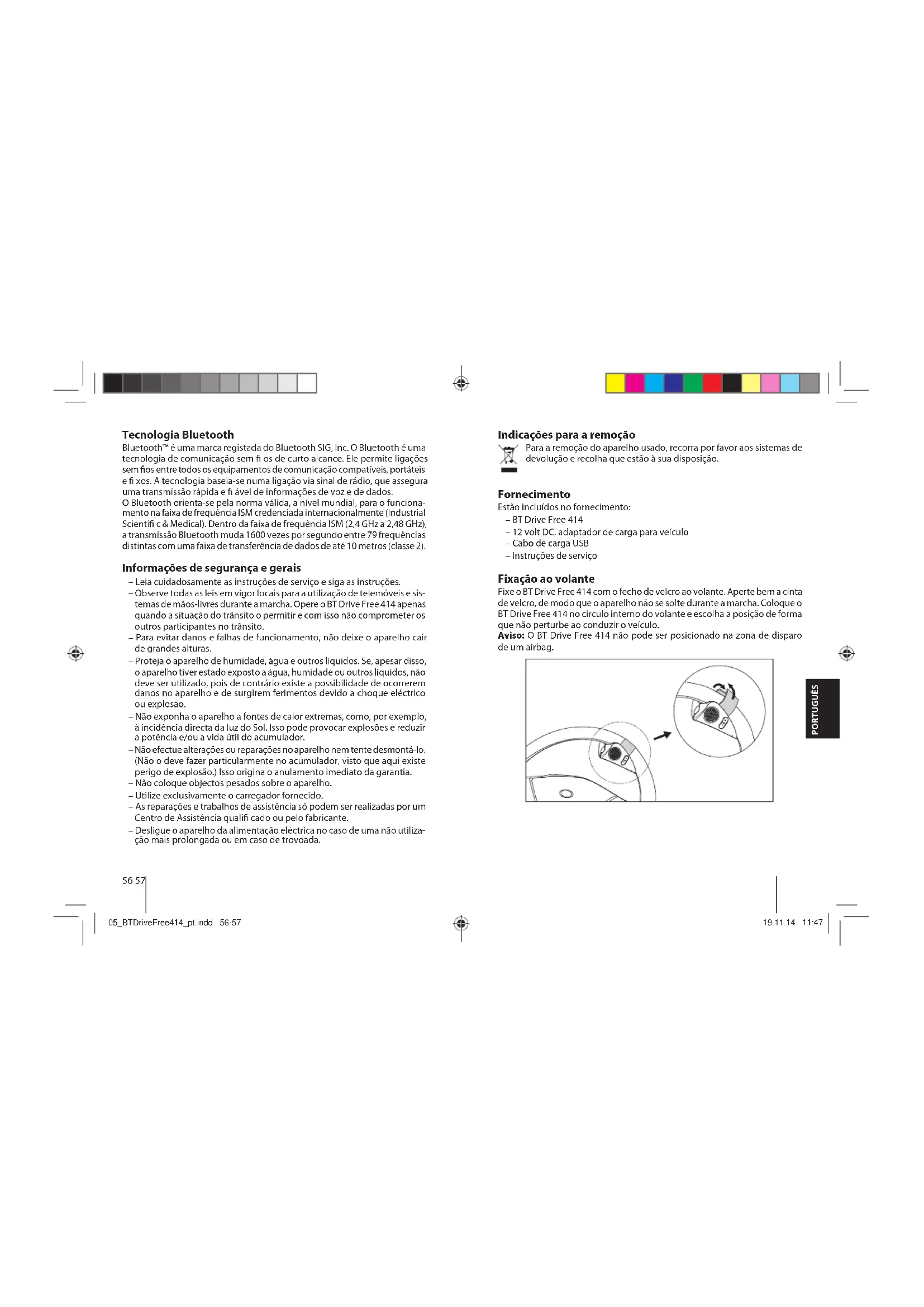 iempo en modo de espera Hasta 300 horas Tipo de acumulador Polímero de litio, 3,7 V, 160 mAh, recargable, no intercambiable Cargador CC 5 V - 6V, 300mA Sujeto a modi caciones. 05_BTDriveFree414_pt.indd 54-5505_BTDriveFree414_pt.indd 54-55 19.11.14 11:4719.11.14 11:4756 57 PORTUGUÊS Tecnologia Bluetooth Bluetooth™ é uma marca registada do Bluetooth SIG, lnc. O Bluetooth é uma tecnologia de comunicação sem os de curto alcance. Ele permite ligações sem os entre todos os equipamentos de comunicação compatíveis, portáteis e xos. A tecnologia baseia-se numa ligação via sinal de rádio, que assegura uma transmissão rápida e ável de informações de voz e de dados. O Bluetooth orienta-se pela norma válida, a nível mundial, para o funciona- mento na faixa de frequência ISM credenciada internacionalmente (Industrial Scienti c & Medical). Dentro da faixa de frequência ISM (2,4 GHz a 2,48 GHz), a transmissão Bluetooth muda 1600 vezes por segundo entre 79 frequências distintas com uma faixa de transferência de dados de até 10 metros (classe 2). Informações de segurança e gerais – Leia cuidadosamente as instruções de serviço e siga as instruções. – Observe todas as leis em vigor locais para a utilização de telemóveis e sis- temas de mãos-livres durante a marcha. Opere o BT Drive Free 414 apenas quando a situação do trânsito o permitir e com isso não comprometer os outros participantes no trânsito. – Para evitar danos e falhas de funcionamento, não deixe o aparelho cair de grandes alturas. – Proteja o aparelho de humidade, água e outros líquidos. Se, apesar disso, o aparelho tiver estado exposto a água, humidade ou outros líquidos, não deve ser utilizado, pois de contrário existe a possibilidade de ocorrerem danos no aparelho e de surgirem ferimentos devido a choque eléctrico ou explosão. – Não exponha o aparelho a fontes de calor extremas, como, por exemplo, à incidência directa da luz do Sol. Isso pode provocar explosões e reduzir a potência e/ou a vida útil do acumulador. – Não efectue alterações ou reparações no aparelho nem tente desmontá-lo. (Não o deve fazer particularmente no acumulador, visto que aqui existe perigo de explosão.) Isso origina o anulamento imediato da garantia. – Não coloque objectos pesados sobre o aparelho. – Utilize exclusivamente o carregador fornecido. – As reparações e trabalhos de assistência só podem ser realizadas por um Centro de Assistência quali cado ou pelo fabricante. – Desligue o aparelho da alimentação eléctrica no caso de uma não utiliza- ção mais prolongada ou em caso de trovoada. Indicações para a remoção Para a remoção do aparelho usado, recorra por favor aos sistemas de devolução e recolha que estão à sua disposição. Fornecimento Estão incluídos no fornecimento: – BT Drive Free 414 – 12 volt DC, adaptador de carga para veículo – Cabo de carga USB – Instruções de serviço Fixação ao volante Fixe o BT Drive Free 414 com o fecho de velcro ao volante. Aperte bem a cinta de velcro, de modo que o aparelho não se solte durante a marcha. Coloque o BT Drive Free 414 no circulo interno do volante e escolha a posição de forma que não perturbe ao conduzir o veículo. Aviso: O BT Drive Free 414 não pode ser posicionado na zona de disparo de um airbag. 05_BTDriveFree414_pt.indd 56-5705_BTDriveFree414_pt.indd 56-57 19.11.14 11:4719.11.14 11:4758 59 PORTUGUÊS Visão geral Tecla MF (tecla multifunções iluminada) Altifalante Reduzir o volume (–) Aumentar o volume (+) Microfone Tomada de carregamento (ligação Micro USB) Fecho de velcro para xar no volante Informações do acumulador O aparelho está equipado com um acumulador de polímeros de lítio inte- grado. O acumulador não pode ser trocado. Não tente retirar o acumulador do aparelho, visto que isso pode dani car o aparelho. A potência total de um acumulador novo só é alcançada após dois ou três ciclos de carga/descarga completos. O acumulador pode ser carregado e novamente descarregado algumas centenas de vezes, no entanto, a sua capacidade vai diminuindo ao longo do tempo. Separe o BT Drive Free 414 da alimentação eléctrica, logo que o acumulador esteja totalmente carregado, visto que um carregamento em excesso origina uma redução da vida útil do acumulador. Um acumulador carregado perde capacidade se não for utilizado. Importante: Certi que-se que o acumulador está totalmente carregado, caso não utilize o aparelho durante um longo período de tempo. Para evitar uma descarga total do acumulador, deverá carregar o BT Drive Free 414, no mínimo, de 2 em 2 meses. Carregar o acumulador O BT Drive Free 414 utiliza um acumulador recarregável. Antes da primeira utilização carregue o acumulador completamente. Leia o capítulo "Informa- ções do acumulador”, antes de iniciar o processo de carga. Deve retirar o BT Drive Free 414 do volante para o processo de carga. A toma- da de carregamento encontra-se na parte lateral da carcaça que encosta no volante. Conecte o BT Drive Free 414 através do cabo USB com o adaptador de carga para veículo. Encaixe o adaptador de carga para veículo no isqueiro do veículo. O BT Drive Free 414 também pode ser carregado no computador utilizando o cabo USB. Nota: Logo que o carregador é ligado, o BT Drive Free 414 desliga-se. Durante o processo de carregamento a tecla MF acende a vermelho. Quando o acumulador está completamente carregado, a tecla MF acende a azul. O processo de carregamento do acumulador dura aprox. 3 horas. Separe o BT Drive Free 414 após o carregamento do carregador. Um acumulador completamente carregado tem uma autonomia de 7 horas de conversação e um tempo de standby de 300 horas. Se o estado de carga do acumulador se tornar fraco, a tecla MF pisca a cada 3 segundos a vermelho e ouve sinais de aviso em intervalos de 60 segundos. 05_BTDriveFree414_pt.indd 58-5905_BTDriveFree414_pt.indd 58-59 19.11.14 11:4719.11.