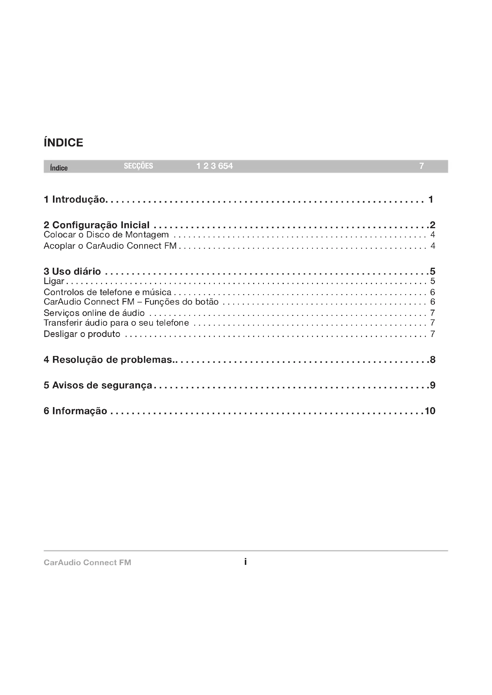 - 6 Informação CarAudio Connect FM PT-1 SECÇÕES 2 3 654Índice 1 INTRODUÇÃO Características p. 10
