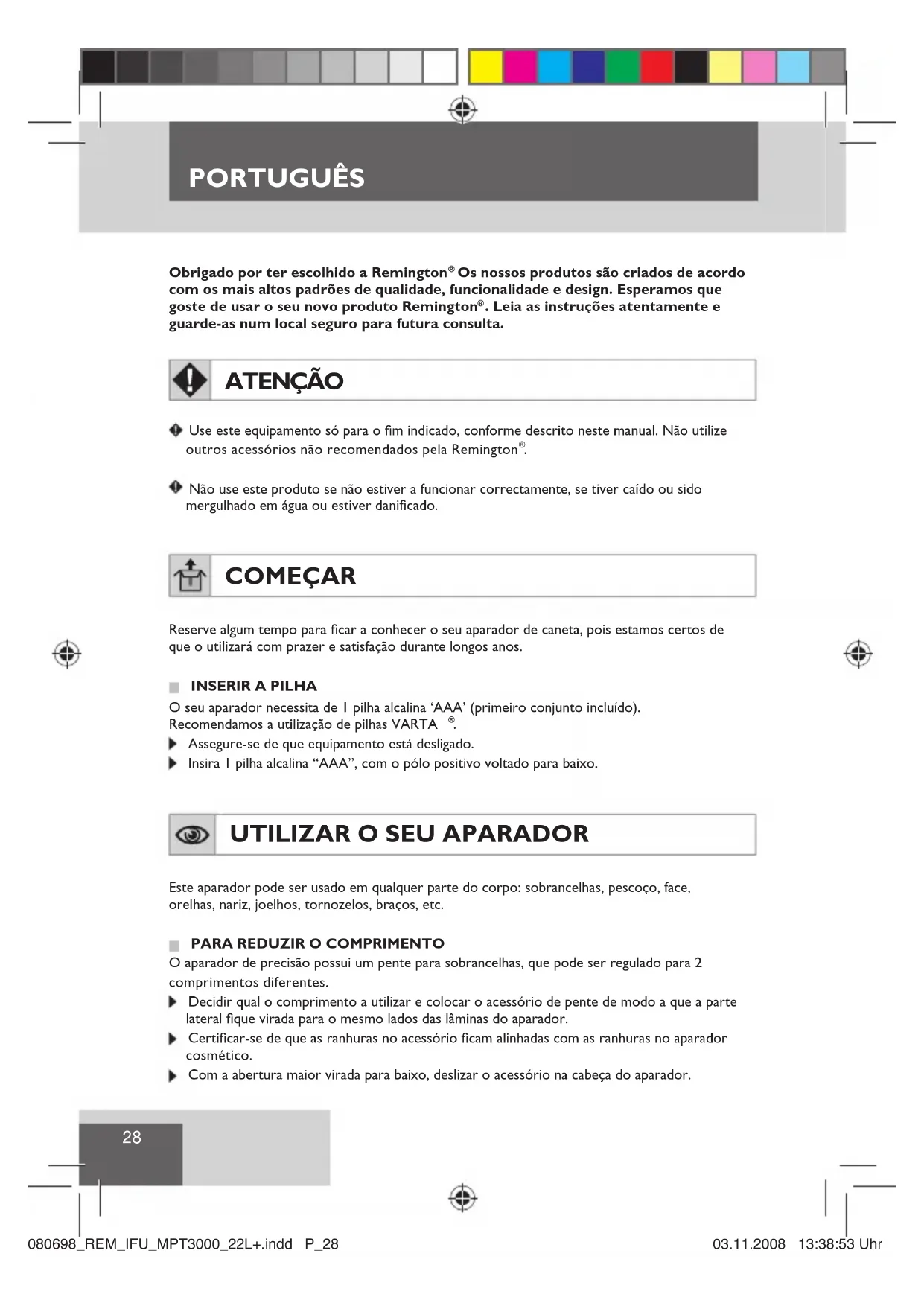 O aparador de precisão possui um pente para sobrancelhas, que pode ser regulado para 2 comprimentos diferentes. Decidir qual o comprimento a utilizar e colocar o acessório de pente de modo a que a parte lateral fique virada para o mesmo lados das lâminas do aparador. Certificar-se de que as ranhuras no acessório ficam alinhadas com as ranhuras no aparador cosmético. Com a abertura maior virada para baixo, deslizar o acessório na cabeça do aparador. 080698_REM_IFU_MPT3000_22L+.indd P_28080698_REM_IFU_MPT3000_22L+.indd P_28 03.11.2008 13:38:53 Uhr03.11.2008 13:38:53 UhrPORTUGUÊS