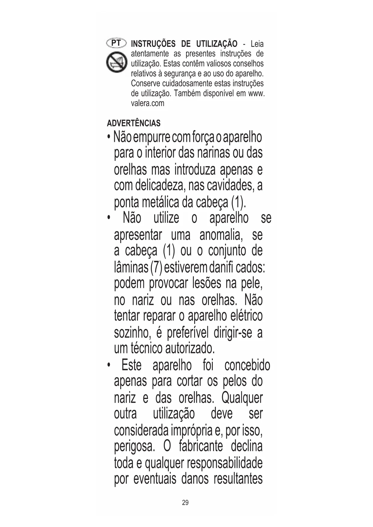- Este aparelho foi concebido apenas para cortar os pelos do nariz e das orelhas. Qualquer outra utilização deve ser considerada imprópria e, por isso, perigosa. O fabricante declina toda e qualquer responsabilidade por eventuais danos resultantes