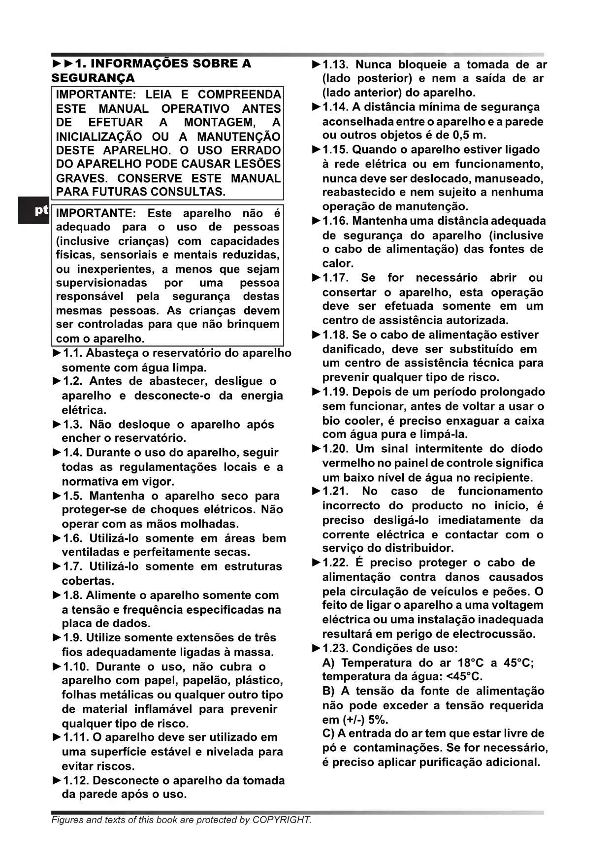 PARA FUTURAS CONSULTAS. IMPORTANTE: Este aparelho não é adequado para o uso de pessoas (inclusive crianças) com capacidades físicas, sensoriais e mentais reduzidas, ou inexperientes, a menos que sejam supervisionadas por uma pessoa responsável pela segurança destas mesmas pessoas. As crianças devem ser controladas para que não brinquem com o aparelho. ►1.1. Abasteça o reservatório do aparelho somente com água limpa. ►1.2. Antes de abastecer, desligue o aparelho e desconecte-o da energia elétrica. ►1.3. Não desloque o aparelho após encher o reservatório. ►1.4. Durante o uso do aparelho, seguir todas as regulamentações locais e a normativa em vigor. ►1.5. Mantenha o aparelho seco para proteger-se de choques elétricos. Não operar com as mãos molhadas. ►1.6. Utilizá-lo somente em áreas bem ventiladas e perfeitamente secas. ►1.7. Utilizá-lo somente em estruturas cobertas. ►1.8. Alimente o aparelho somente com a tensão e frequência especicadas na placa de dados. ►1.9. Utilize somente extensões de três os adequadamente ligadas à massa. ►1.10. Durante o uso, não cubra o aparelho com papel, papelão, plástico, folhas metálicas ou qualquer outro tipo de material inamável para prevenir qualquer tipo de risco. ►1.11. O aparelho deve ser utilizado em uma superfície estável e nivelada para evitar riscos. ►1.12. Desconecte o aparelho da tomada da parede após o uso. ►1.13. Nunca bloqueie a tomada de ar (lado posterior) e nem a saída de ar (lado anterior) do aparelho. ►1.14. A distância mínima de segurança aconselhada entre o aparelho e a parede ou outros objetos é de 0,5 m. ►1.15. Quando o aparelho estiver ligado à rede elétrica ou em funcionamento, nunca deve ser deslocado, manuseado, reabastecido e nem sujeito a nenhuma operação de manutenção. ►1.16. Mantenha uma distância adequada de segurança do aparelho (inclusive o cabo de alimentação) das fontes de calor. ►1.17. Se for necessário abrir ou consertar o aparelho, esta operação deve ser efetuada somente em um centro de assistência autorizada. ►1.18. Se o cabo de alimentação estiver danicado, deve ser substituído em um centro de assistência técnica para prevenir qualquer tipo de risco. ►1.19. Depois de um período prolongado sem funcionar, antes de voltar a usar o bio cooler, é preciso enxaguar a caixa com água pura e limpá-la. ►1.20. Um sinal intermitente do díodo vermelho no painel de controle signica um baixo nível de água no recipiente. ►1.21. No caso de funcionamento incorrecto do producto no início, é preciso desligá-lo imediatamente da corrente eléctrica e contactar com o serviço do distribuidor. ►1.22. É preciso proteger o cabo de alimentação contra danos causados pela circulação de veículos e peões. O feito de ligar o aparelho a uma voltagem eléctrica ou uma instalação inadequada resultará em perigo de electrocussão. ►1.23. Condições de uso: A) Temperatura do ar 18°C a 45°C; temperatura da água: <45°C. B) A tensão da fonte de alimentação não pode exceder a tensão requerida em (+/-) 5%. C) A entrada do ar tem que estar livre de pó e contaminações. Se for necessário, é preciso aplicar puricação adicional. Figures and texts of this book are protected by COPYRIGHT.pt ►►2. DESEMBALAGEM ►2.1. Remova todos os materiais de embalagem utilizados para confecionar e enviar o aparelho e elimine-os segundo as normas em vigor. ►2.2. Extraia todos os artigos da embalagem. ►2.3. Controle para vericar se houve danos ocorridos durante o transporte. Se o aparelho estiver danicado, informe imediatamente o concessionário onde foi adquirido. ►►3. MONTAGEM O aparelho é dotado de rodas para facilitar a movimentação. Dependendo do modelo, as rodas podem estar já instaladas ou não. Os componentes com os respectivos parafusos e porcas de montagem encontram-se dentro da embalagem (Fig. 1). ►►4. FUNCIONAMENTO ADVERTÊNCIA: Leia atentamente as