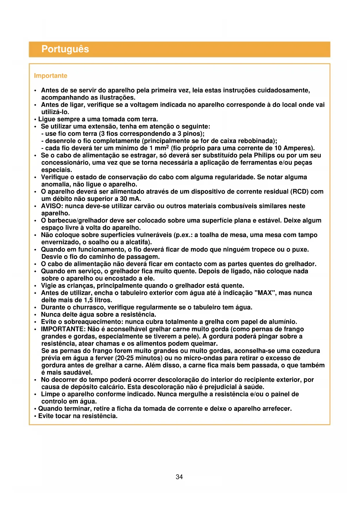 - Se o cabo de alimentação se estragar, só deverá ser substituído pela Philips ou por um seu concessionário, uma vez que se torna necessária a aplicação de ferramentas e/ou peças especiais.