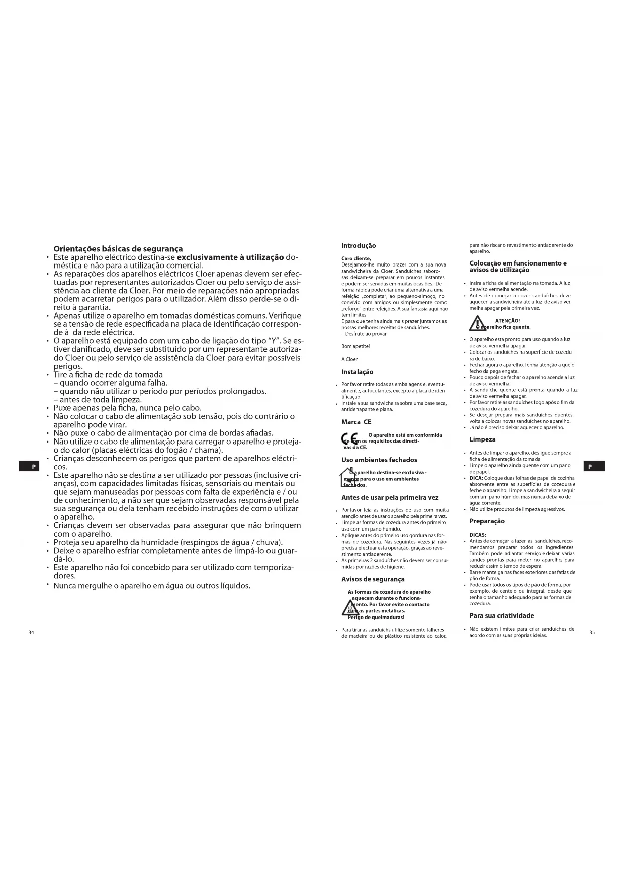 requisitos de las directivas comu-Introdução Caro cliente, Desejamos-lhe muito prazer com a sua nova sandwicheira da Cloer. Sanduíches saboro- sas deixam-se preparar em poucos instantes e podem ser servidas em muitas ocasiões. De forma rápida pode criar uma alternativa a uma refeição „completa“, ao pequeno-almoço, no convívio com amigos ou simplesmente como „reforço“ entre refeições. A sua fantasia aqui não tem limites. E para que tenha ainda mais prazer juntamos as nossas melhores receitas de sanduíches. – Desfrute ao provar – Bom apetite! A Cloer Instalação Por favor retire todas as embalagens e, eventu- almente, autocolantes, excepto a placa de iden- tificação. Instale a sua sandwicheira sobre uma base seca, antiderrapante e plana. Marca CE O aparelho está em conformida de com os requisitos das directi- vas da CE. Uso ambientes fechados O aparelho destina-se exclusiva - mente para o uso em ambientes fechados. Antes de usar pela primeira vez Por favor leia as instruções de uso com muita atenção antes de usar o aparelho pela primeira vez. Limpe as formas de cozedura antes do primeiro uso com um pano húmido. Aplique antes do primeiro uso gordura nas for- mas de cozedura. Nas seguintes vezes já não precisa efectuar esta operação, graças ao reve- stimento antiaderente. As primeiras 2 sanduíches não devem ser consu- midas por razões de higiene. Avisos de segurança As formas de cozedura do aparelho aquecem durante o funciona- mento. Por favor evite o contacto com as partes metálicas. Perigo de queimaduras! Para tirar as sanduíchs utilize somente talheres de madeira ou de plástico resistente ao calor,