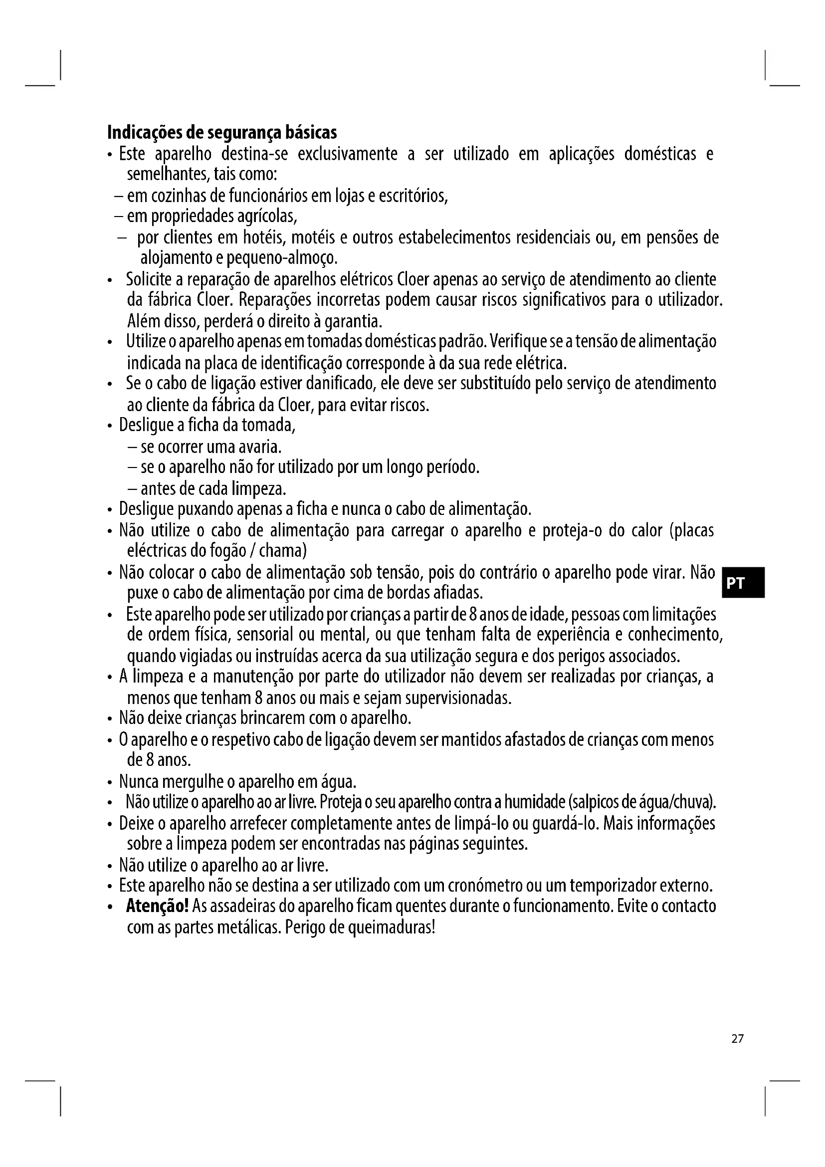 Os aparelhos elétricos Cloer cumprem as diretivas atuais da CE e as normas de segurança. No caso improvável de o aparelho Cloer ter algum defeito ou não funcionar corretamente, entre em contacto com o revendedor ou com o serviço de atendimento ao cliente da fábrica da Cloer. O nosso serviço de atendimento ao cliente da fábrica também está disponível para clientes regulares registados.