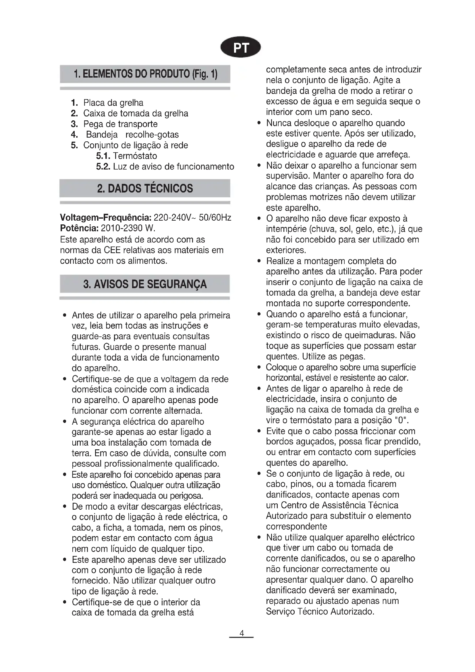 Voltagem–Frequência: 220-240V~ 50/60Hz Potência: 2010-2390 W. Este aparelho está de acordo com as normas da CEE relativas aos materiais em contacto com os alimentos.5
