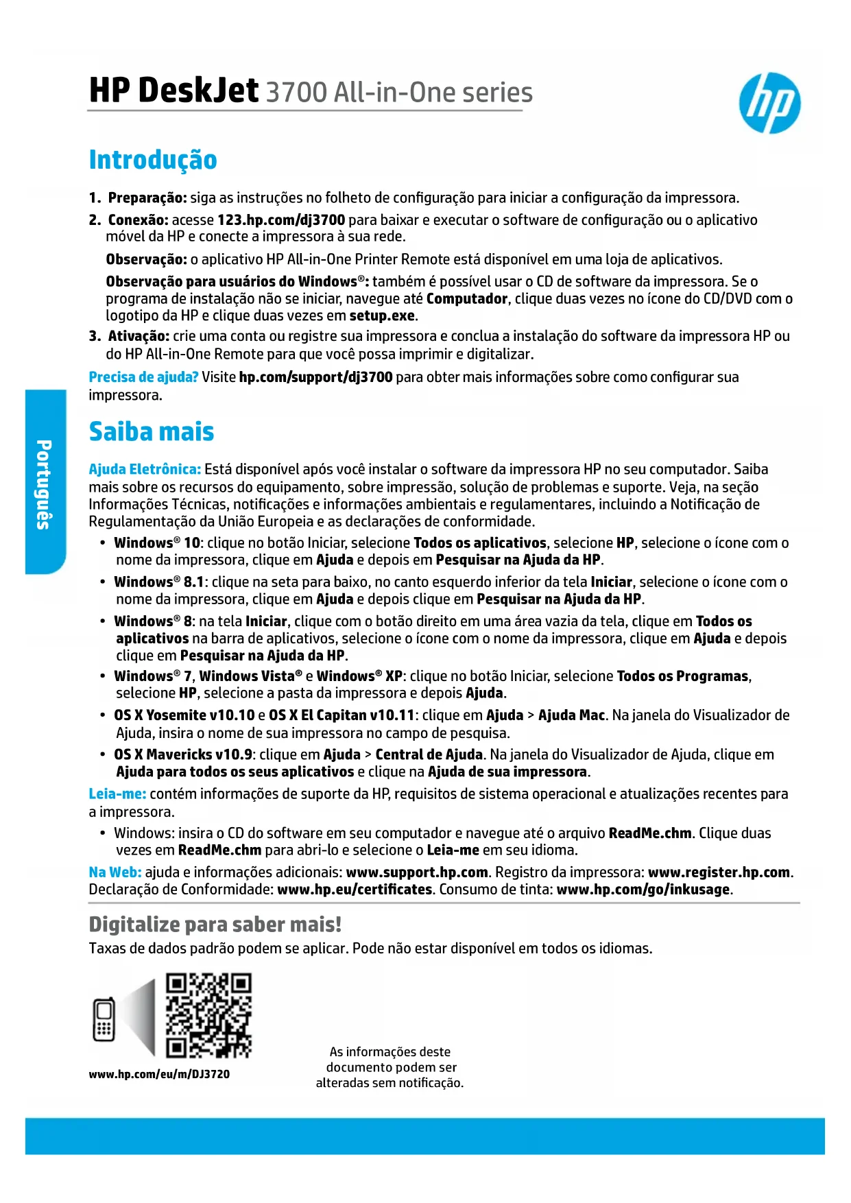 - Windows: insira o CD do software em seu computador e navegue até o arquivo ReadMe.chm. Clique duas vezes em ReadMe.chm para abri-lo e selecione o Leia-me em seu idioma. Na Web: ajuda e informações adicionais: www.support.hp.com. Registro da impressora: www.register.hp.com. Declaração de Conformidade: www.hp.eu/certicates. Consumo de tinta: www.hp.com/go/inkusage. HP DeskJet 3700 All-in-One series Digitalize para saber mais! Taxas de dados padrão podem se aplicar. Pode não estar disponível em todos os idiomas.As informações deste documento podem ser alteradas sem noticação.Português