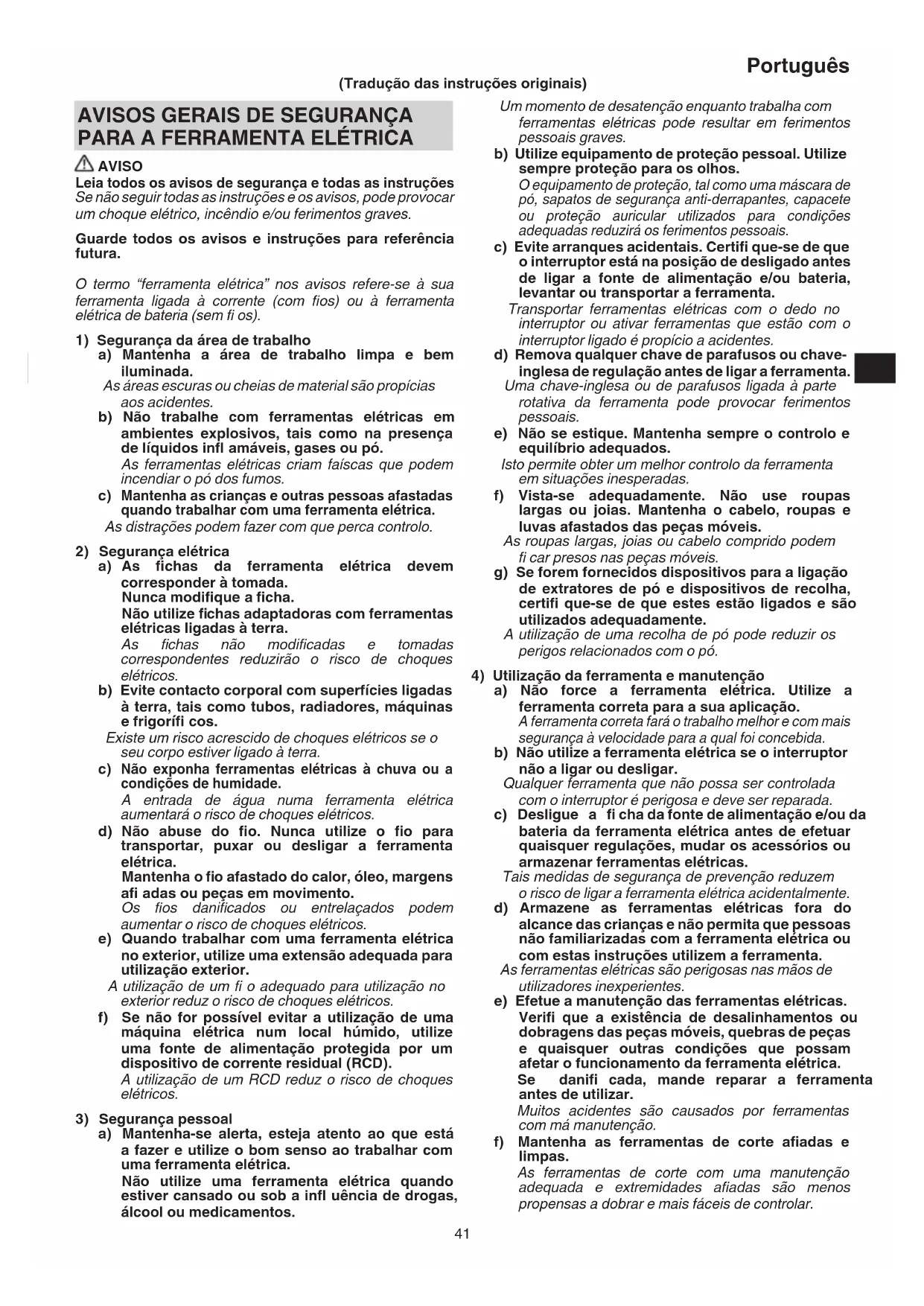 AVISO Leia todos os avisos de segurança e todas as instruções Se não seguir todas as instruções e os avisos, pode provocar um choque elétrico, incêndio e/ou ferimentos graves. Guarde todos os avisos e instruções para referência futura. O termo “ferramenta elétrica” nos avisos refere-se à sua ferramenta ligada à corrente (com fi os) ou à ferramenta elétrica de bateria (sem fi os).