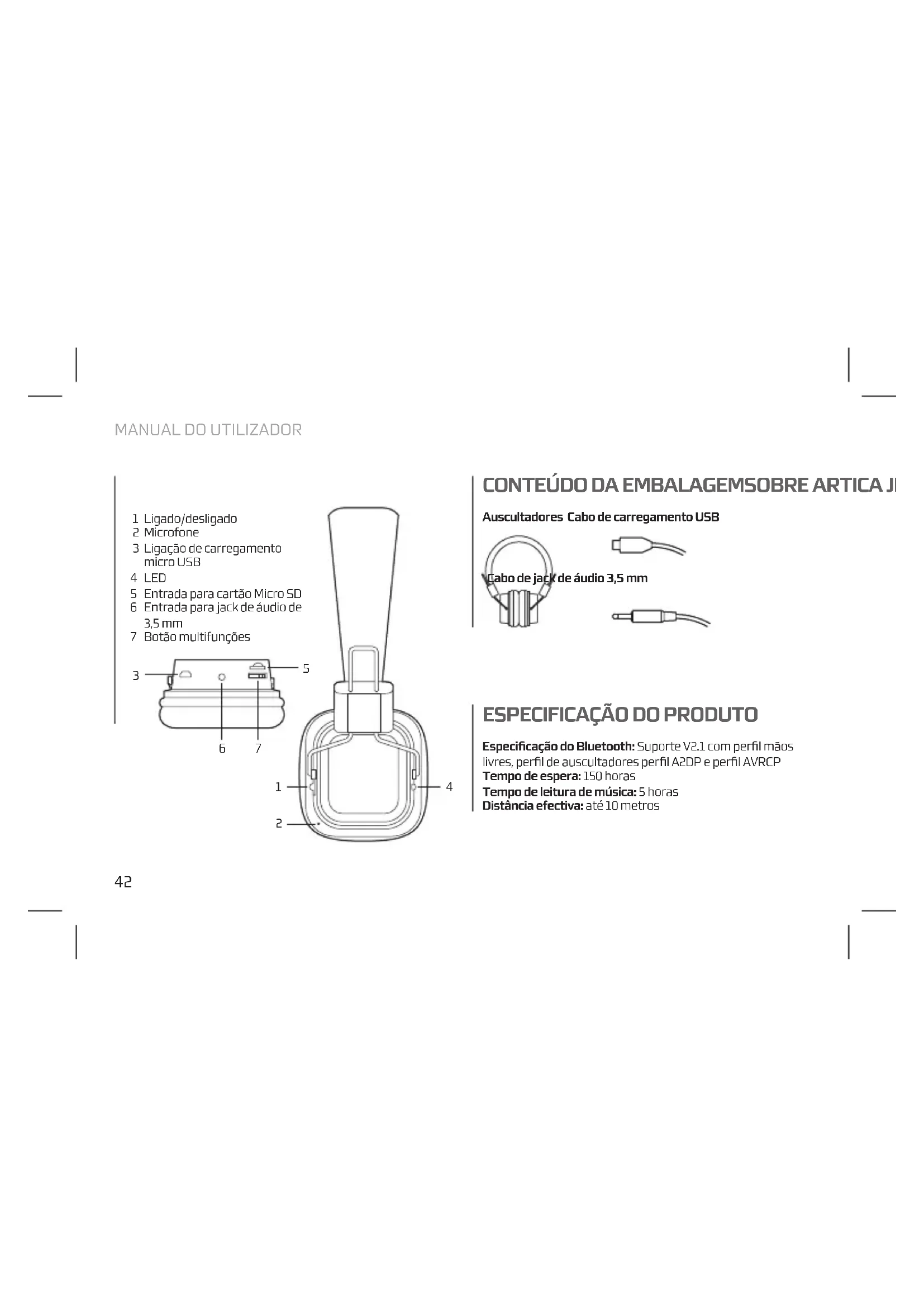 Especificação do Bluetooth: Suporte V2.1 com perfil mãos livres, perfil de auscultadores perfil A2DP e perfil AVRCP Tempo de espera: 150 horas Tempo de leitura de música: 5 horas Distância efectiva: até 10 metros