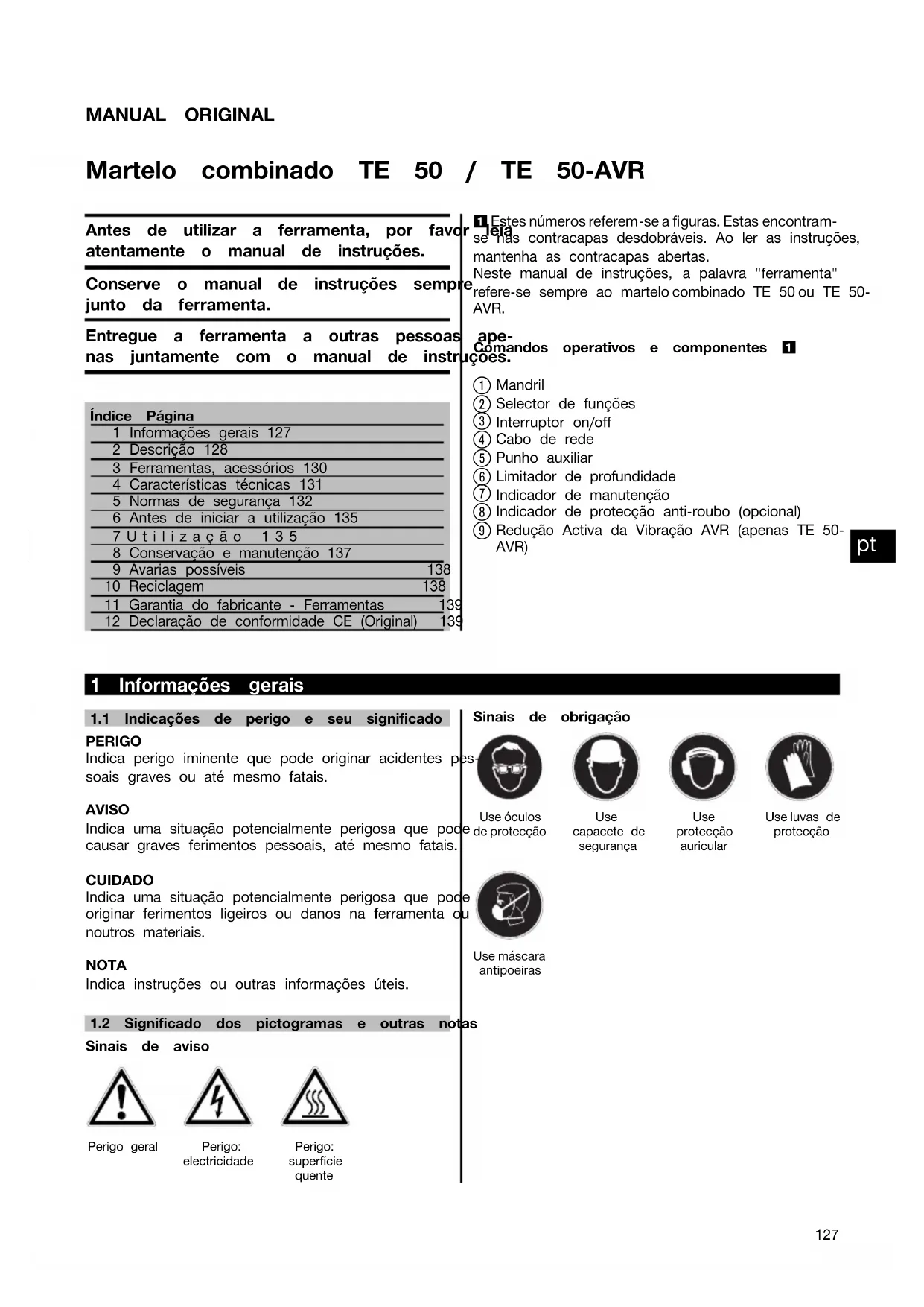 Printed: 08.07.2013 | Doc-Nr: PUB / 5070996 / 000 / 02MANUAL ORIGINAL Martelo combinado TE 50 / TE 50‑AVR Antes de utilizar a ferramenta, por favor leia atentamente o manual de instruções. Conserve o manual de instruções sempre junto da ferramenta. Entregue a ferramenta a outras pessoas ape- nas juntamente com o manual de instruções. Índice Página1 Informações gerais 1272 Descrição 1283 Ferramentas, acessórios 1304 Características técnicas 1315 Normas de segurança 1326 Antes de iniciar a utilização 1357Utilização 1358 Conservação e manutenção 1379 Avarias possíveis 13810 Reciclagem 13811 Garantia do fabricante - Ferramentas 13912 Declaração de conformidade CE (Original) 139 1 Estes números referem-se a figuras. Estas encontram- se nas contracapas desdobráveis. Ao ler as instruções,mantenha as contracapas abertas. Neste manual de instruções, a palavra "ferramenta" refere-se sempre ao martelo combinado TE 50 ou TE 50- AVR. Comandos operativos e componentes 1 Mandril Selector de funções Interruptor on/off Cabo de rede Punho auxiliar Limitador de profundidade Indicador de manutenção Indicador de protecção anti-roubo (opcional) Redução Activa da Vibração AVR (apenas TE 50- AVR) 1 Informações gerais 1.1 Indicações de perigo e seu significadoPERIGOIndica perigo iminente que pode originar acidentes pes-soais graves ou até mesmo fatais.AVISOIndica uma situação potencialmente perigosa que podecausar graves ferimentos pessoais, até mesmo fatais.CUIDADOIndica uma situação potencialmente perigosa que podeoriginar ferimentos ligeiros ou danos na ferramenta ounoutros materiais. NOTA Indica instruções ou outras informações úteis.1.2 Significado dos pictogramas e outras notasSinais de avisoPerigo geral Perigo:electricidadePerigo:superfíciequenteSinais de obrigaçãoUse óculosde protecção Use capacete desegurança Use protecçãoauricularUse luvas deprotecçãoUse máscaraantipoeiras