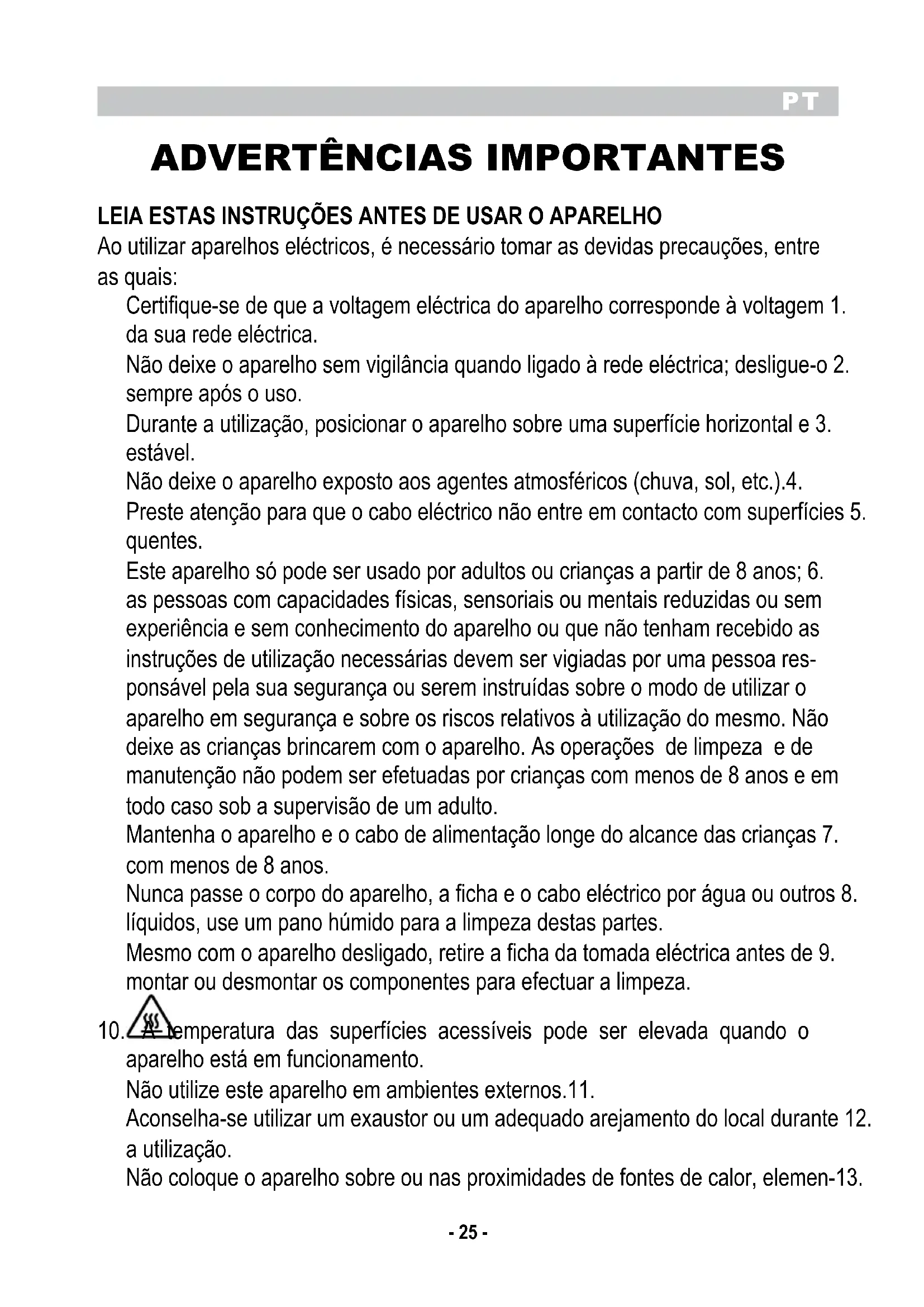 aparelho está em funcionamento. Não utilize este aparelho em ambientes externos.11. Aconselha-se utilizar um exaustor ou um adequado arejamento do local durante 12. a utilização. Não coloque o aparelho sobre ou nas proximidades de fontes de calor, elemen-13.PT