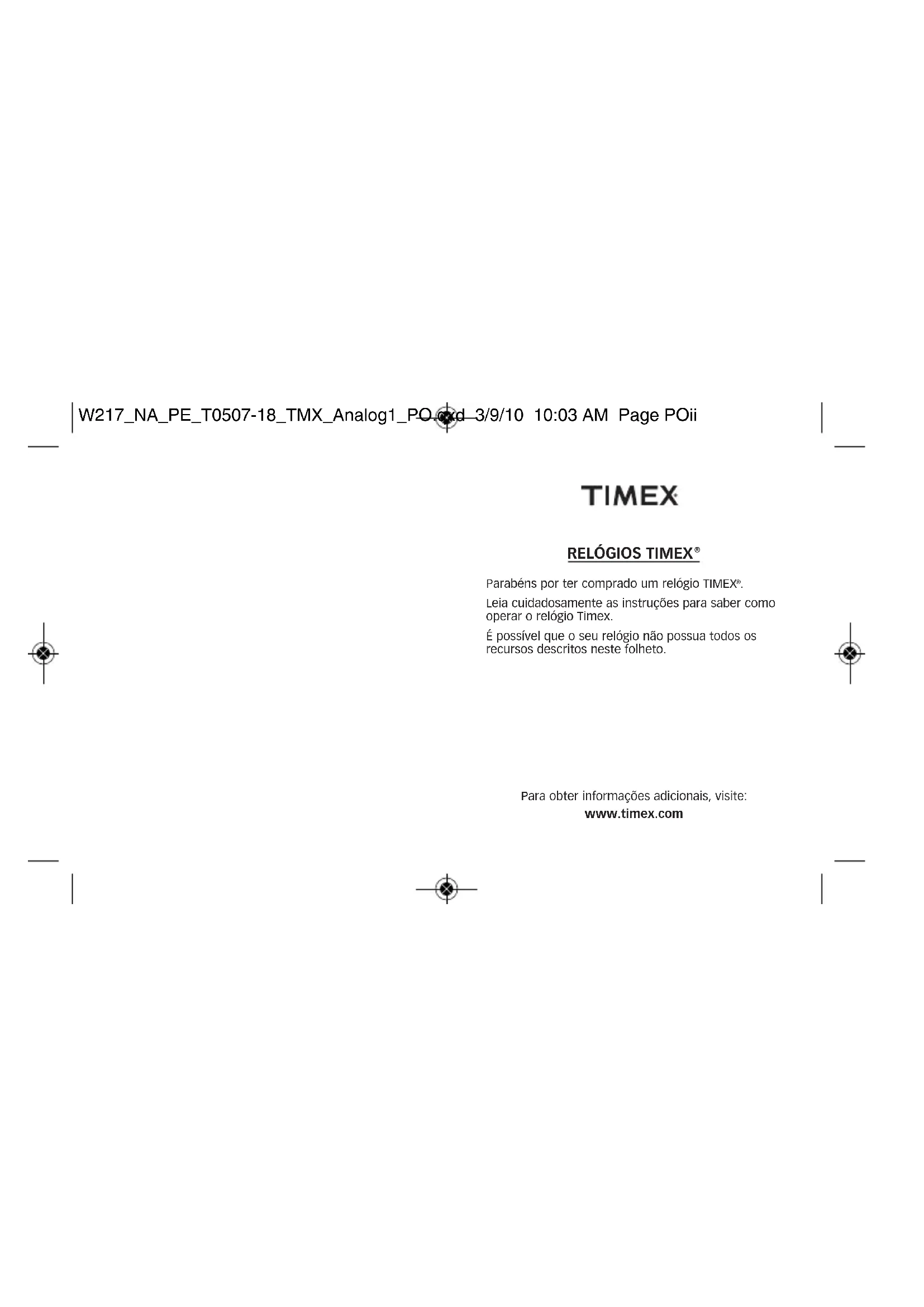 Leia cuidadosamente as instruções para saber como operar o relógio Timex. É possível que o seu relógio não possua todos os recursos descritos neste folheto. Para obter informações adicionais, visite: www.timex.com W217_PE_CEU_T0507-18_TMX_Analog1_PO.qxd 3/9/10 10:41 AM Page POiiÍNDICE 86 Como iniciar o funcionamento do relógio 87 Resistência à água e a choques 88 Luz noturna Indiglo