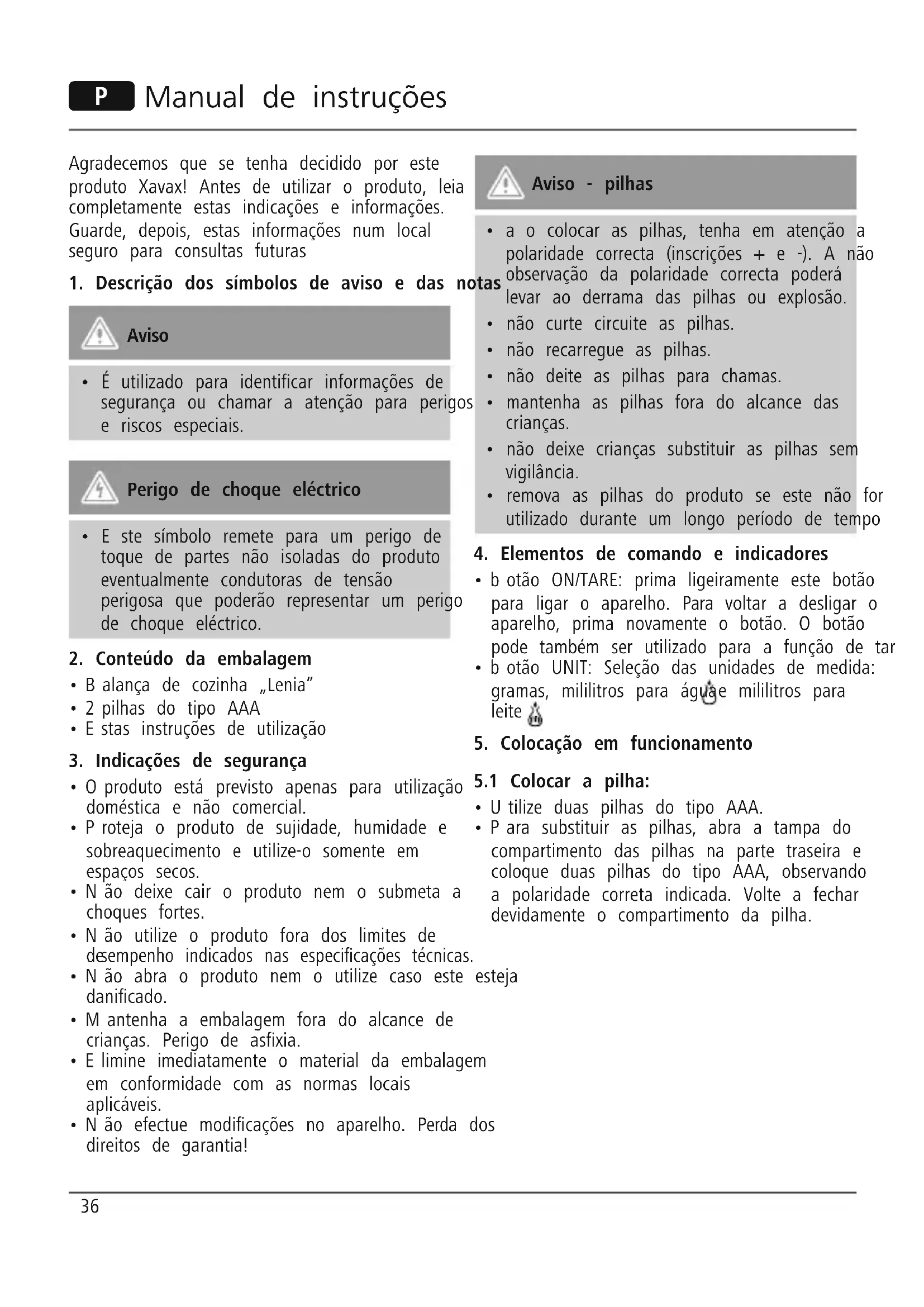 - Não efectue modicações no aparelho. Perda dos direitos de garantia! Aviso - pilhas