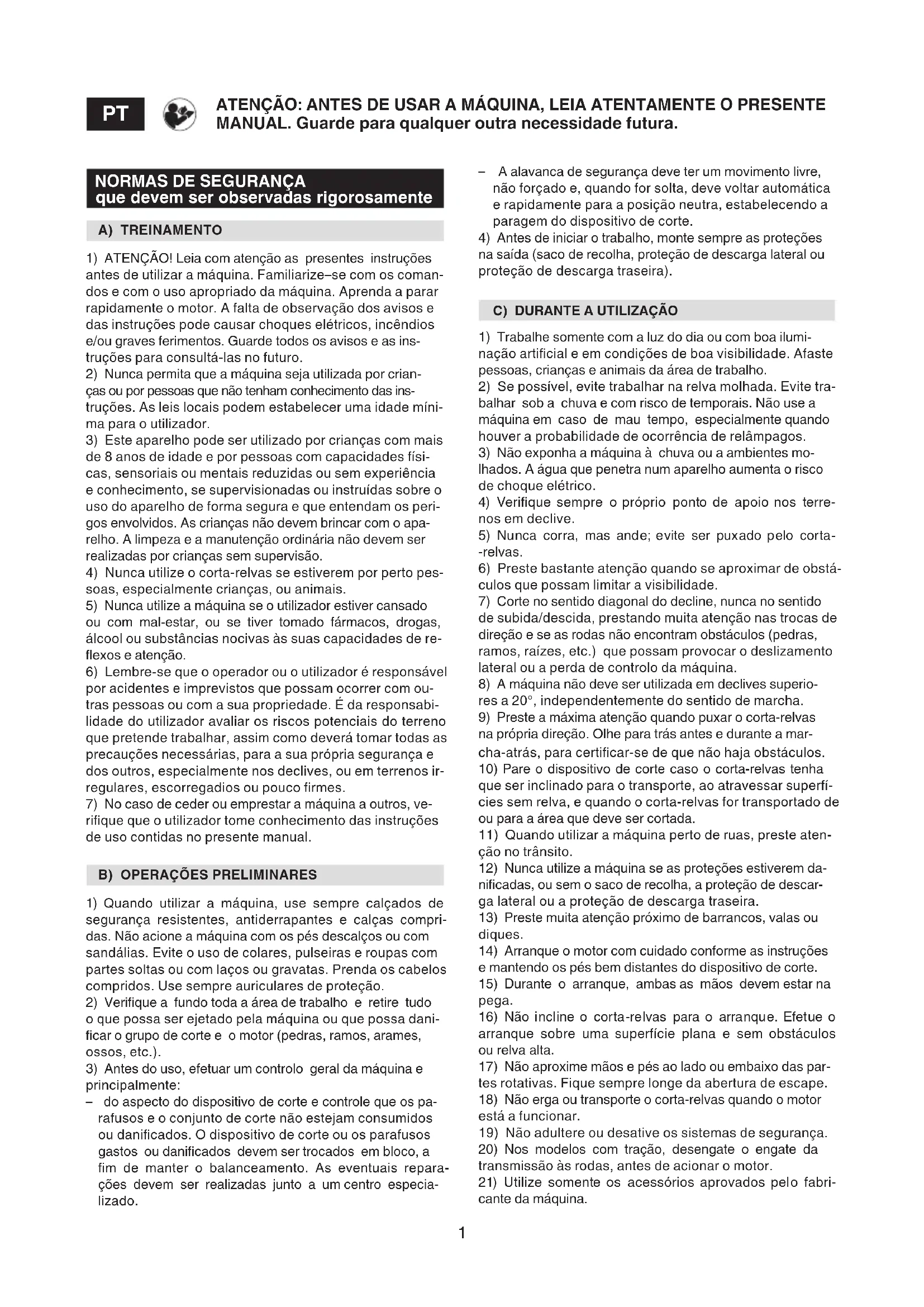 ATENÇÃO: ANTES DE USAR A MÁQUINA, LEIA ATENTAMENTE O PRESENTE MANUAL. Guarde para qualquer outra necessidade futura. – A alavanca de segurança deve ter um movimento livre, não forçado e, quando for solta, deve voltar automática e rapidamente para a posição neutra, estabelecendo a paragem do dispositivo de corte.