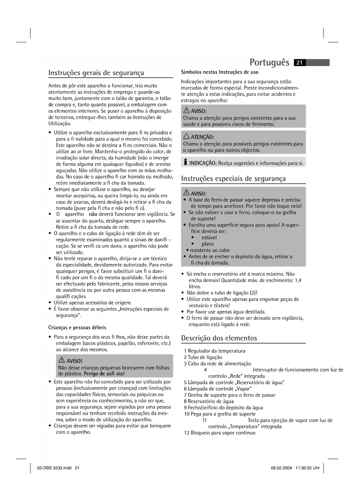 - O ferro de passar não deve ser deixado sem vigilância, enquanto está ligado à rede. Descrição dos elementos 1 Regulador da temperatura 2 Tubo de ligação 3 Cabo da rede de alimentação 4 Interruptor de funcionamento com luz de controlo „Rede“ integrada 5 Lâmpada de controle „Reservatório de água“ 6 Lâmpada de controle „Vapor“ 7 Grelha de suporte para o ferro de passar 8 Reservatório de água 9 Fecho/orifício do depósito da água 10 Pega para a grelha de suporte 11 Tecla para ejecção de vapor com luz de controlo „Temperatura“ integrada 12 Bloqueio para vapor contínuo 05-DBS 5533.indd 2105-DBS 5533.indd 21 09.02.2009 11:36:52 Uhr09.02.2009 11:36:52 UhrPortuguês