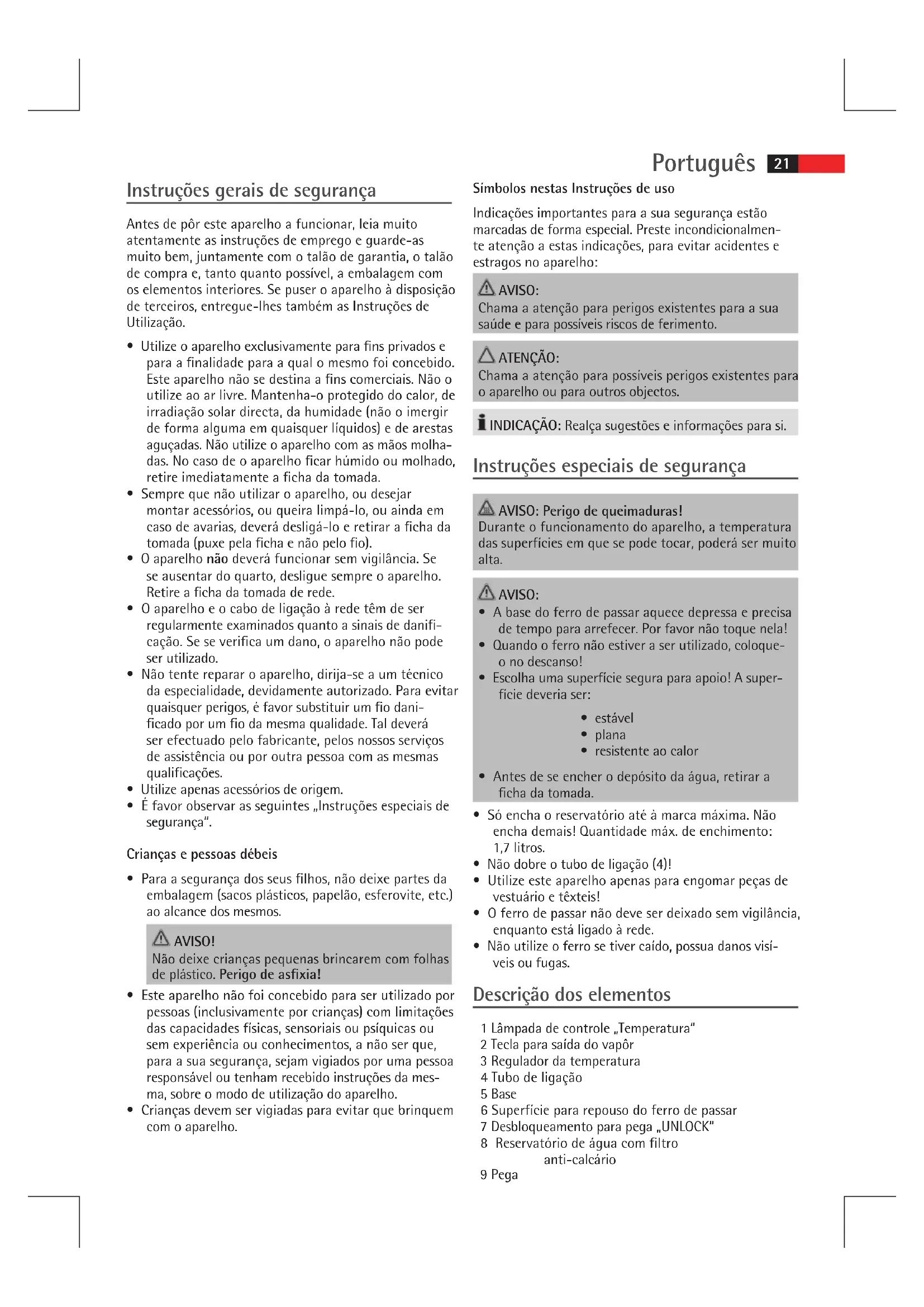 - Não utilize o ferro se tiver caído, possua danos visí- veis ou fugas. Descrição dos elementos 1 Lâmpada de controle „Temperatura“ 2 Tecla para saída do vapôr 3 Regulador da temperatura 4 Tubo de ligação 5 Base 6 Superfície para repouso do ferro de passar 7 Desbloqueamento para pega „UNLOCK“ 8 Reservatório de água com ltro anti-calcário 9 PegaPortuguês