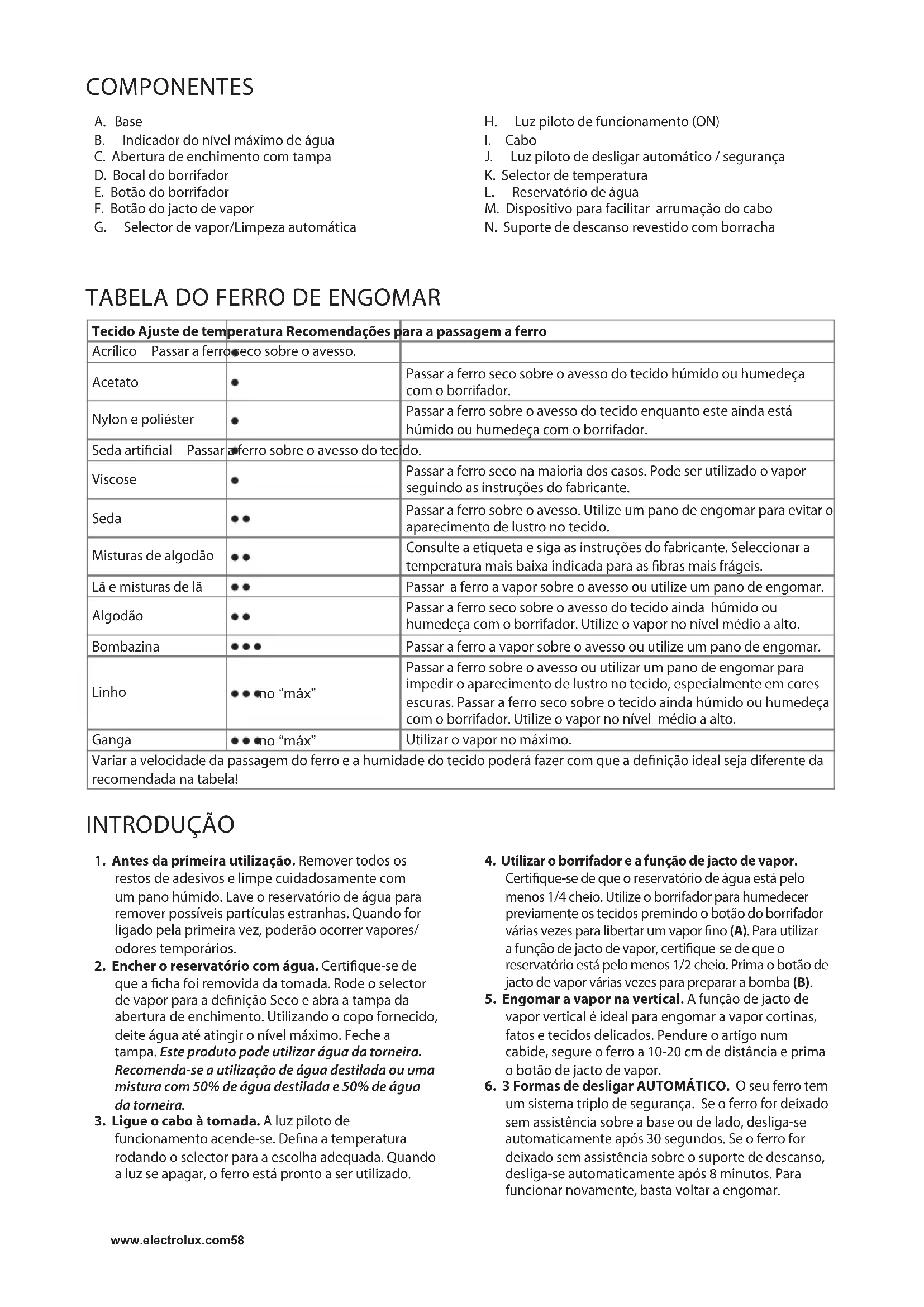um sistema triplo de segurança. Se o ferro for deixado semassistênciasobreabaseoudelado,desliga-se automaticamente após 30 segundos. Se o ferro for deixadosemassistênciasobreosuportededescanso, desliga-se automaticamente após 8 minutos. Para funcionar novamente, basta voltar a engomar. www.electrolux.com58LIMPEZA (NÃO UTILIZE NENHUM DETERGENTE)