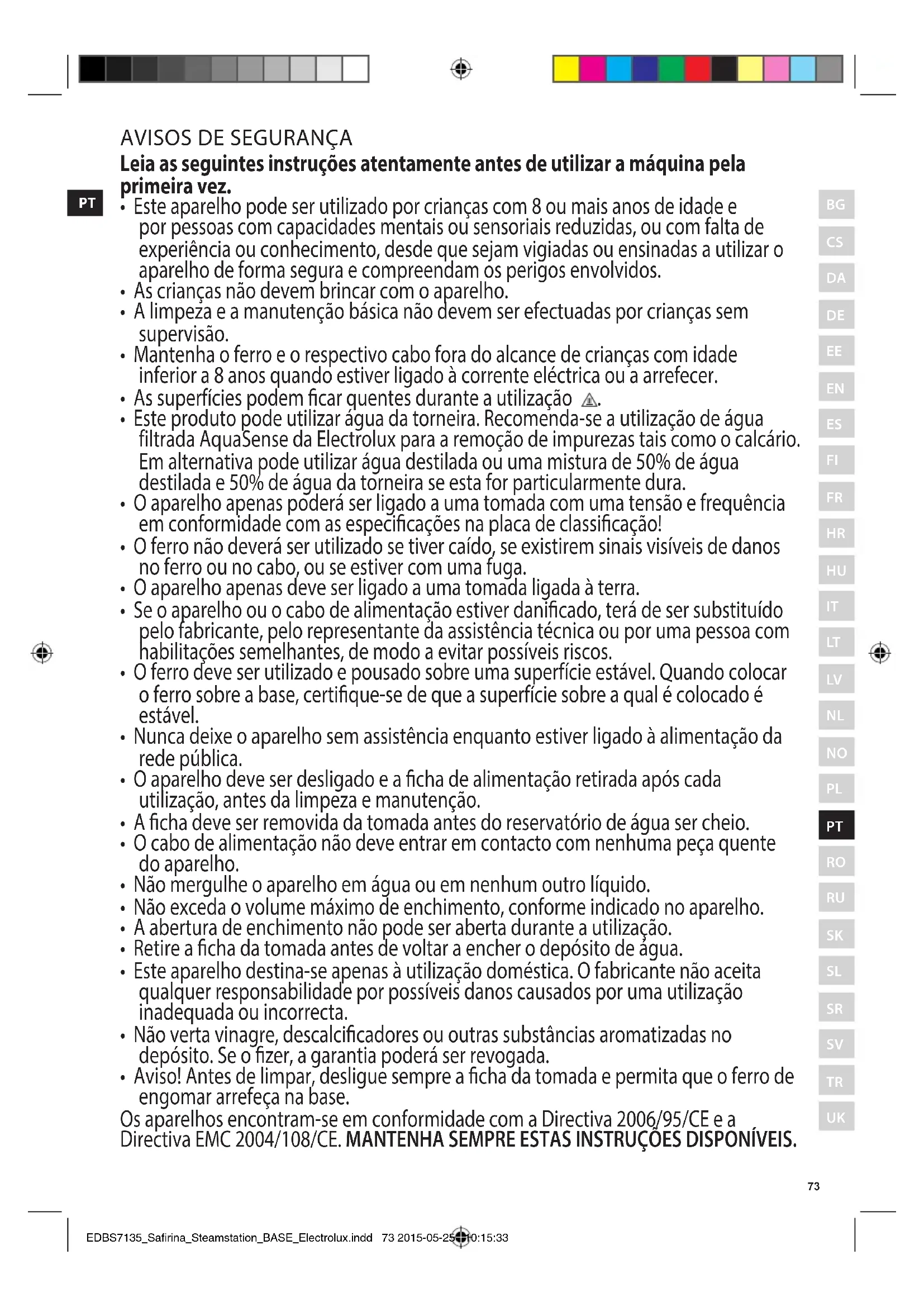 - Aviso! Antes de limpar, desligue sempre a cha da tomada e permita que o ferro de engomar arrefeça na base. Os aparelhos encontram-se em conformidade com a Directiva 2006/95/CE e a Directiva EMC 2004/108/CE. MANTENHA SEMPRE ESTAS INSTRUÇÕES DISPONÍVEIS.