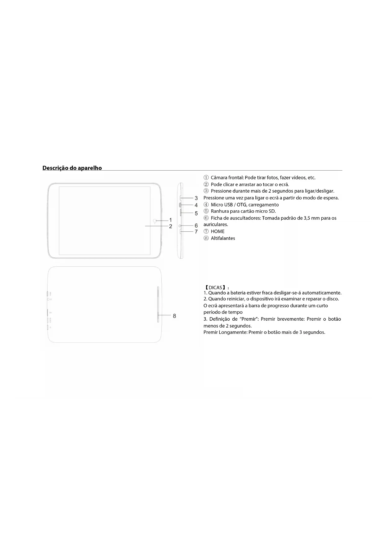 ④ Micro USB / OTG, carregamento