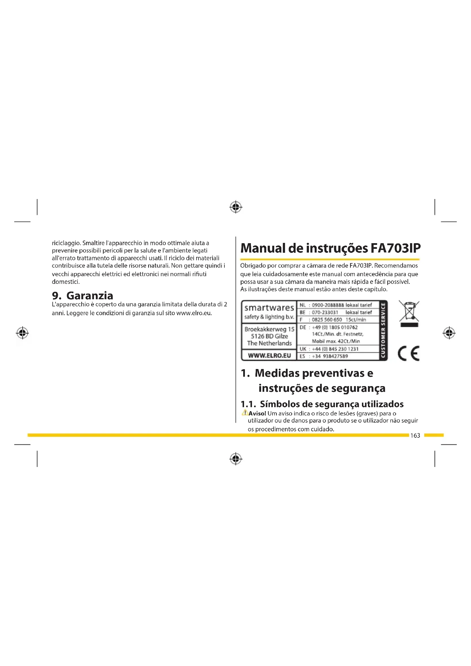 L'apparecchio è coperto da una garanzia limitata della durata di 2 anni. Leggere le condizioni di garanzia sul sito www.elro.eu.164 deixar que outra pessoa o faça, nem é permitido que repare o produto nem que o mande reparar. Em tais casos a garantia deixará de estar válida. Qualquer manutenção só pode ser executada por pessoal técnico certicado. Aviso! Use apenas acessórios originais do fabricante. Aviso! Mantenha o produto fora do alcance de crianças. Aviso! Desligue o dispositivo de todas as fontes de corrente antes de o limpar. Aviso! Use um pano limpo e seco para limpar o produto. Aviso! Não use nenhum agente abrasivo, produtos de limpeza corrosivos ou substâncias que contenham lixívia ou dissolventes para limpar o produto. Aviso! Retire o adaptador da tomada de corrente durante tempestades, trovoada e sempre que o produto não seja usado durante um longo período de tempo. Nota! Instale o produto de acordo com o indicado neste manual. Em caso de dúvida, consulte um técnico reconhecido e tenha sempre em atenção os códigos e regulamentos locais de instalação. Nota! A câmara deve ser mantida fora da luz direta do sol. Nota! Não aponte a câmara a arbustos, ramos das árvores ou outros objetos em movimento. Nota! O produto não deve ser descartado como lixo normal, tem de ser descartado separadamente. Nota! Uma nota avisa o utilizador de possíveis problemas.