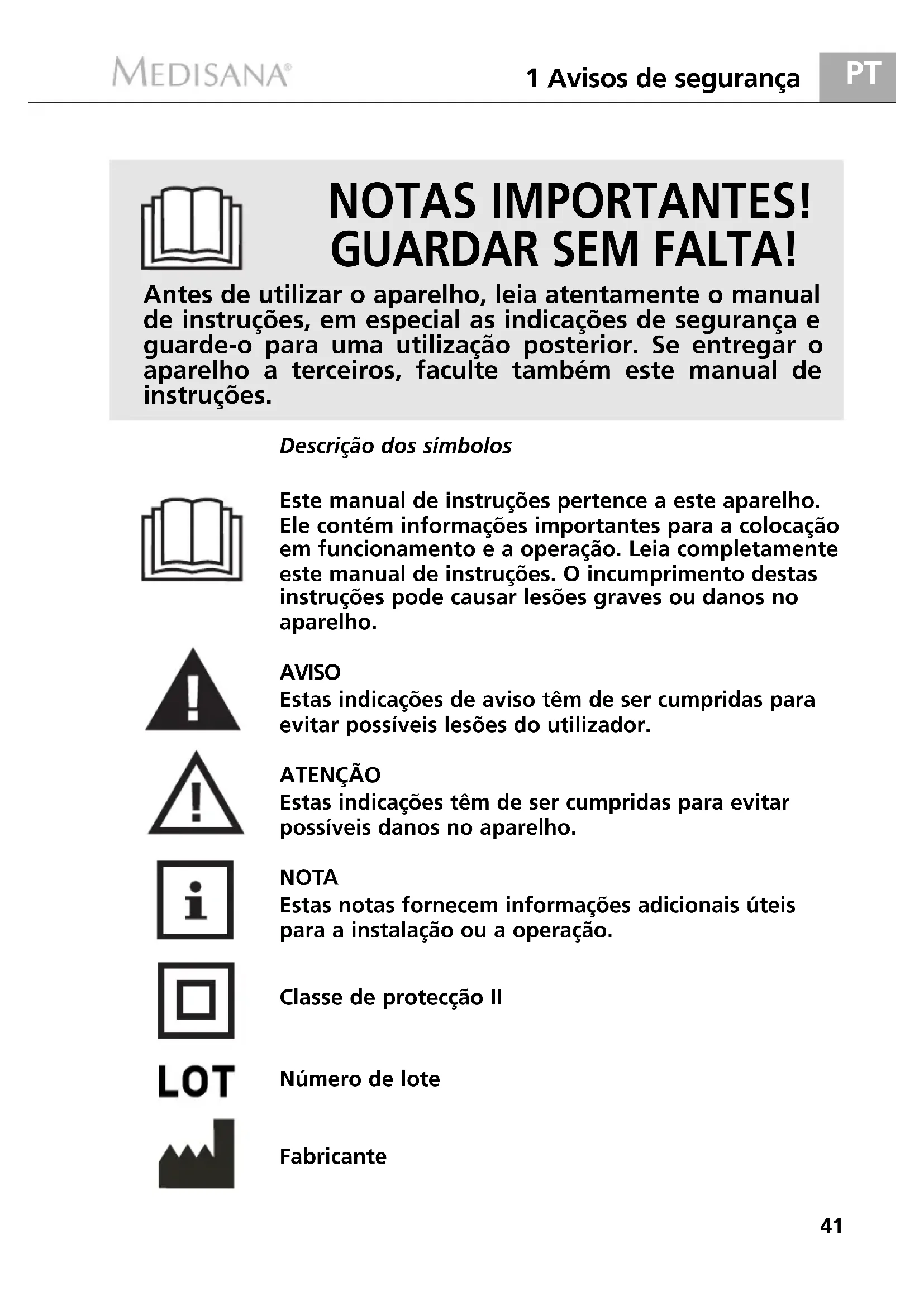1 Avisos de segurança NOTAS IMPORTANTES! GUARDAR SEM FALTA! Este manual de instruções pertence a este aparelho. Ele contém informações importantes para a colocação em funcionamento e a operação. Leia completamente este manual de instruções. O incumprimento destas instruções pode causar lesões graves ou danos no aparelho. AVISO Estas indicações de aviso têm de ser cumpridas para evitar possíveis lesões do utilizador. ATENÇÃO Estas indicações têm de ser cumpridas para evitar possíveis danos no aparelho. NOTA Estas notas fornecem informações adicionais úteis para a instalação ou a operação. Classe de protecção II Número de lote Fabricante Antes de utilizar o aparelho, leia atentamente o manual de instruções, em especial as indicações de segurança e guarde-o para uma utilização posterior. Se entregar o aparelho a terceiros, faculte também este manual de instruções. Descrição dos símbolos 60065_UHW_West_22082014.qxd:Luftbefeuchter 22.08.2014 15:26 Uhr Seite 4142 1 Avisos de segurança