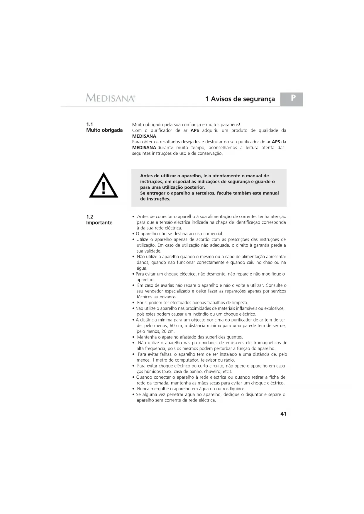 Importante Muito obrigado pela sua confiança e muitos parabéns! Com o purificador de ar APS adquiriu um produto de qualidade da MEDISANA. Para obter os resultados desejados e desfrutar do seu purificador de ar APS da MEDISANA durante muito tempo, aconselhamos a leitura atenta das seguintes instruções de uso e de conservação. Antes de utilizar o aparelho, leia atentamente o manual de instruções, em especial as indicações de segurança e guarde-o para uma utilização posterior. Se entregar o aparelho a terceiros, faculte também este manual de instruções.