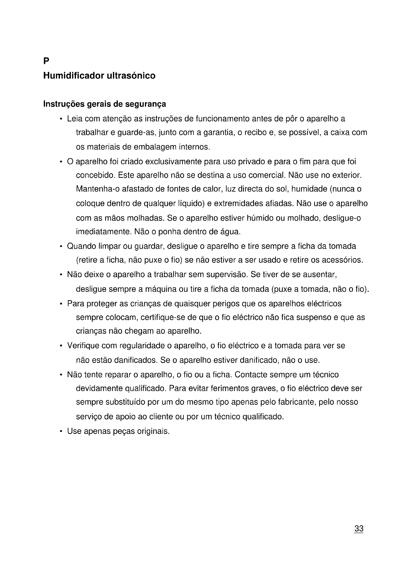 - Não ponha o humidificador ou qualquer das suas peças na máquina de lavar loiça.