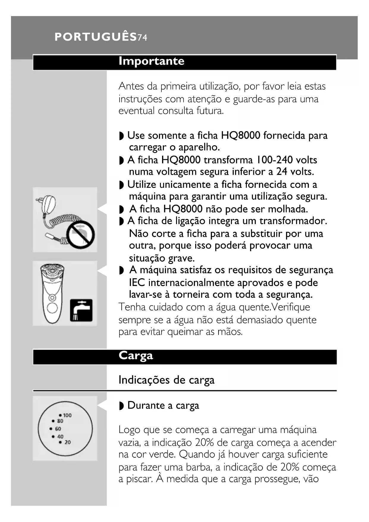 Causa: le batterie sono scariche. ◗ Ricaricate le batterie. ITALIANO 73Importante Antes da primeira utilização, por favor leia estas instruções com atenção e guarde-as para uma eventual consulta futura. ◗ Use somente a ficha HQ8000 fornecida para carregar o aparelho. ◗ A ficha HQ8000 transforma 100-240 volts numa voltagem segura inferior a 24 volts. ◗ Utilize unicamente a ficha fornecida com a máquina para garantir uma utilização segura.