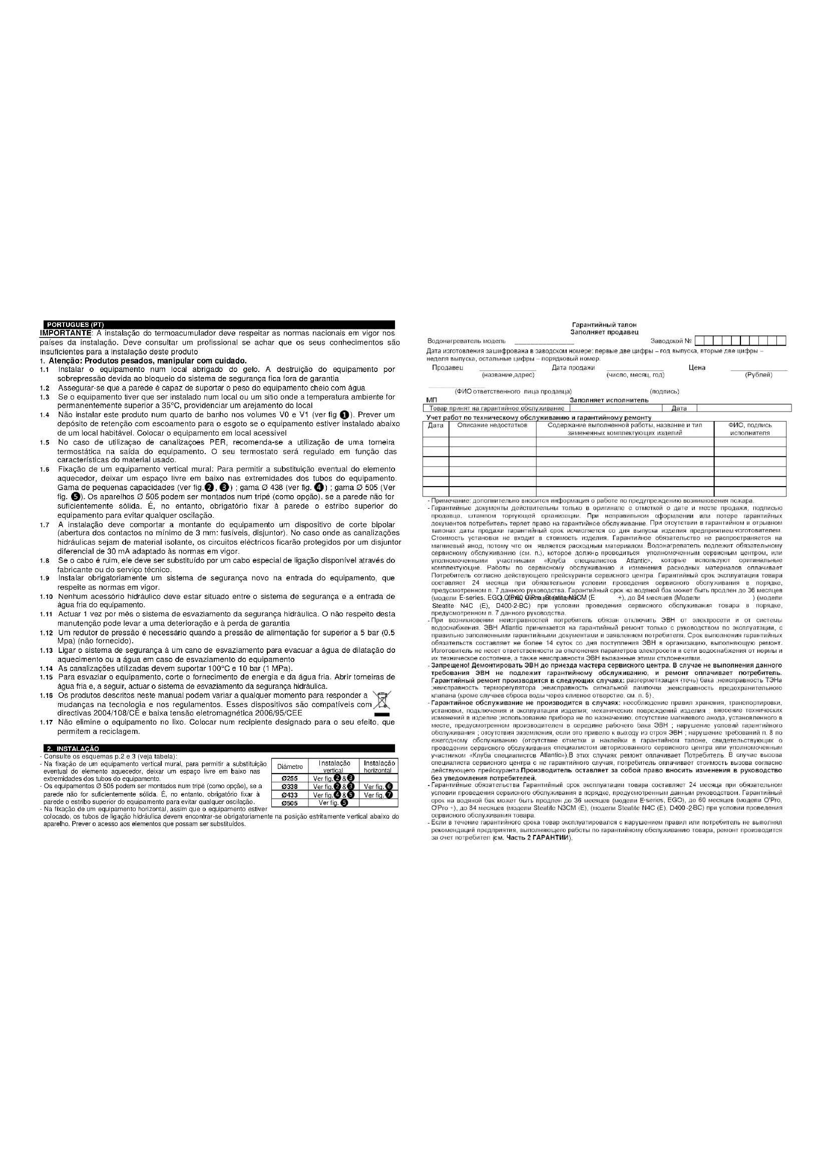PORTUGUES (PT) IMPORTANTE: A instalação do termoacumulador deve respeitar as normas nacionais em vigor nos países da instalação. Deve consultar um profissional se achar que os seus conhecimentos são insuficientes para a instalação deste produto
