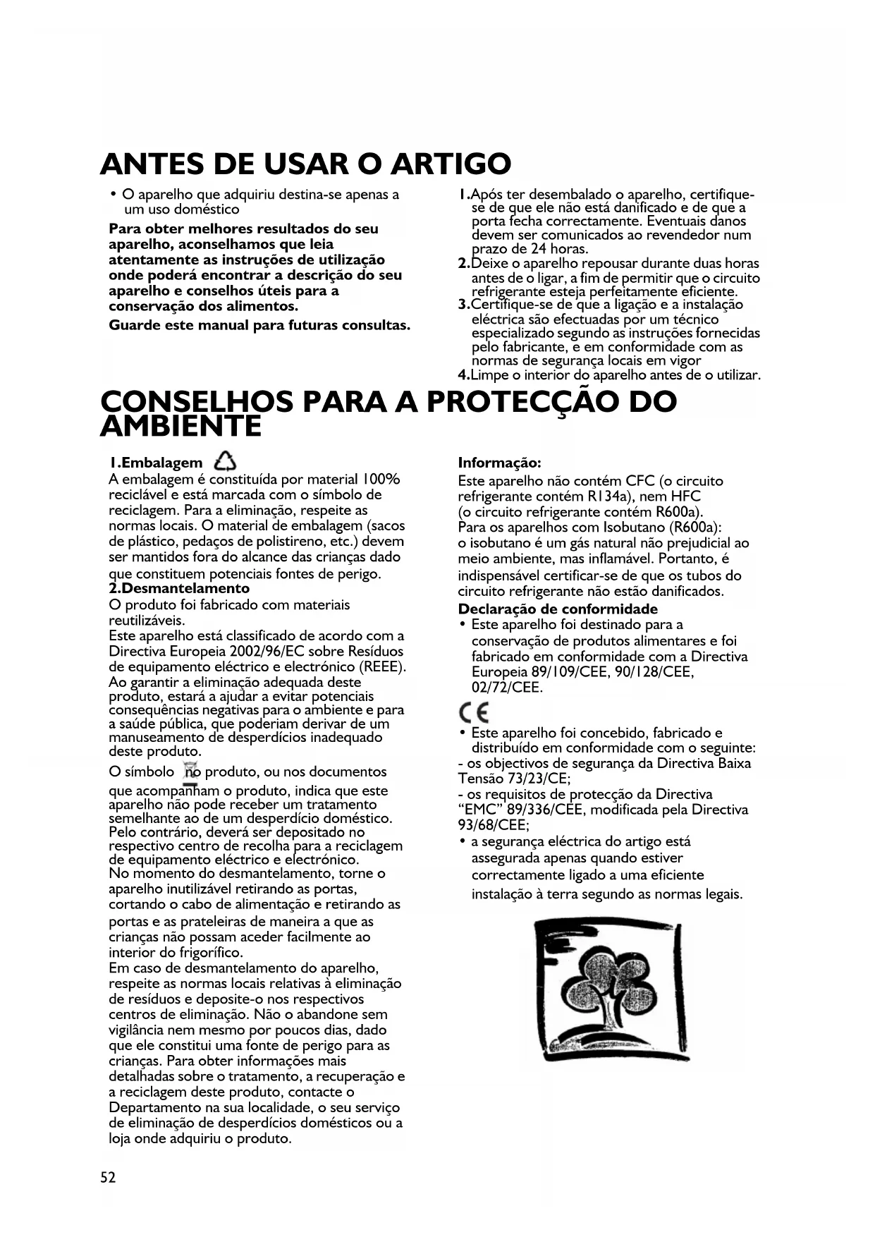 - O aparelho que adquiriu destina-se apenas a um uso doméstico Para obter melhores resultados do seu aparelho, aconselhamos que leia atentamente as instruções de utilização onde poderá encontrar a descrição do seu aparelho e conselhos úteis para a conservação dos alimentos. Guarde este manual para futuras consultas. 1.Após ter desembalado o aparelho, certifique- se de que ele não está danificado e de que a porta fecha correctamente. Eventuais danos devem ser comunicados ao revendedor num prazo de 24 horas. 2.Deixe o aparelho repousar durante duas horas antes de o ligar, a fim de permitir que o circuito refrigerante esteja perfeitamente eficiente. 3.Certifique-se de que a ligação e a instalação eléctrica são efectuadas por um técnico especializado segundo as instruções fornecidas pelo fabricante, e em conformidade com as normas de segurança locais em vigor 4.Limpe o interior do aparelho antes de o utilizar. 1.Embalagem A embalagem é constituída por material 100% reciclável e está marcada com o símbolo de reciclagem. Para a eliminação, respeite as normas locais. O material de embalagem (sacos de plástico, pedaços de polistireno, etc.) devem ser mantidos fora do alcance das crianças dado que constituem potenciais fontes de perigo. 2.Desmantelamento O produto foi fabricado com materiais reutilizáveis. Este aparelho está classificado de acordo com a Directiva Europeia 2002/96/EC sobre Resíduos de equipamento eléctrico e electrónico (REEE). Ao garantir a eliminação adequada deste produto, estará a ajudar a evitar potenciais consequências negativas para o ambiente e para a saúde pública, que poderiam derivar de um manuseamento de desperdícios inadequado deste produto. O símbolo no produto, ou nos documentos que acompanham o produto, indica que este aparelho não pode receber um tratamento semelhante ao de um desperdício doméstico. Pelo contrário, deverá ser depositado no respectivo centro de recolha para a reciclagem de equipamento eléctrico e electrónico. No momento do desmantelamento, torne o aparelho inutilizável retirando as portas, cortando o cabo de alimentação e retirando as portas e as prateleiras de maneira a que as crianças não possam aceder facilmente ao interior do frigorífico. Em caso de desmantelamento do aparelho, respeite as normas locais relativas à eliminação de resíduos e deposite-o nos respectivos centros de eliminação. Não o abandone sem vigilância nem mesmo por poucos dias, dado que ele constitui uma fonte de perigo para as crianças. Para obter informações mais detalhadas sobre o tratamento, a recuperação e a reciclagem deste produto, contacte o Departamento na sua localidade, o seu serviço de eliminação de desperdícios domésticos ou a loja onde adquiriu o produto. Informação: Este aparelho não contém CFC (o circuito refrigerante contém R134a), nem HFC (o circuito refrigerante contém R600a). Para os aparelhos com Isobutano (R600a): o isobutano é um gás natural não prejudicial ao meio ambiente, mas inflamável. Portanto, é indispensável certificar-se de que os tubos do circuito refrigerante não estão danificados. Declaração de conformidade