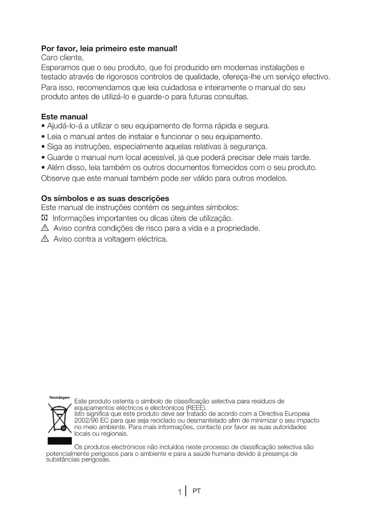 Por favor, leia primeiro este manual! Caro cliente, Esperamos que o seu produto, que foi produzido em modernas instalações e testado através de rigorosos controlos de qualidade, ofereça-lhe um serviço efectivo. Para isso, recomendamos que leia cuidadosa e inteiramente o manual do seu produto antes de utilizá-lo e guarde-o para futuras consultas. Este manual