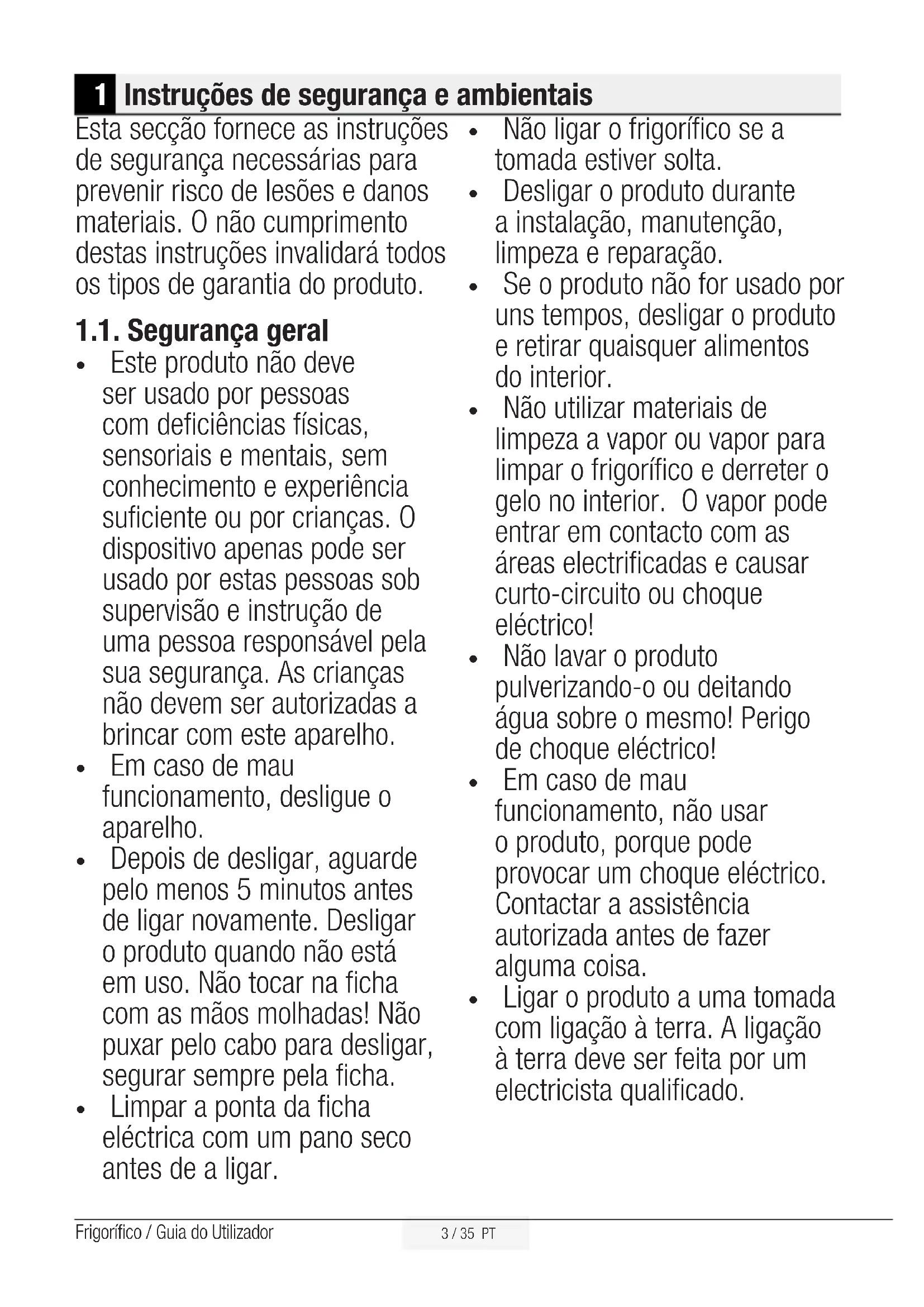 Risco de choque eléctrico. A embalagem do produto é fe- ita com materiais recicláveis, de acordo com a Legislação Ambiental Nacional.2 / 35 PT Frigorífico / Guia do Utilizador 1 Instruções de segurança e ambientais 3 1.1. Segurança geral . . . . . . . . . . . . . . . . . . . . . 3
