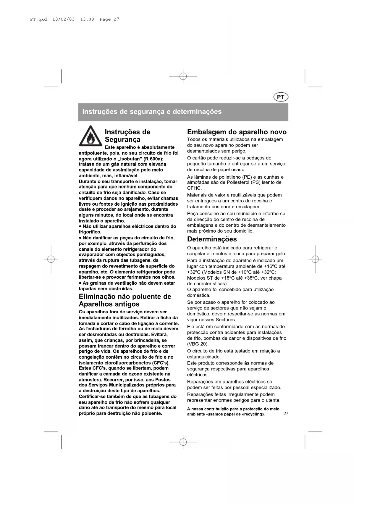 ES.qxd 13/02/03 13:08 Page 49PT.qxd 13/02/03 13:08 Page 26Instruções de segurança e determinações Instruções de Segurança Este aparelho é absolutamente antipoluente, pois, no seu circuito de frio foi agora utilizado o „Isobutan” (R 600a); tratase de um gás natural com elevada capacidade de assimilação pelo meio ambiente, mas, inflamável. Durante o seu transporte e instalação, tomar atenção para que nenhum componente do circuito de frio seja danificado. Caso se verifiquem danos no aparelho, evitar chamas livres ou fontes de ignição nas proximidades deste e proceder ao arejamento, durante alguns minutos, do local onde se encontra instalado o aparelho.