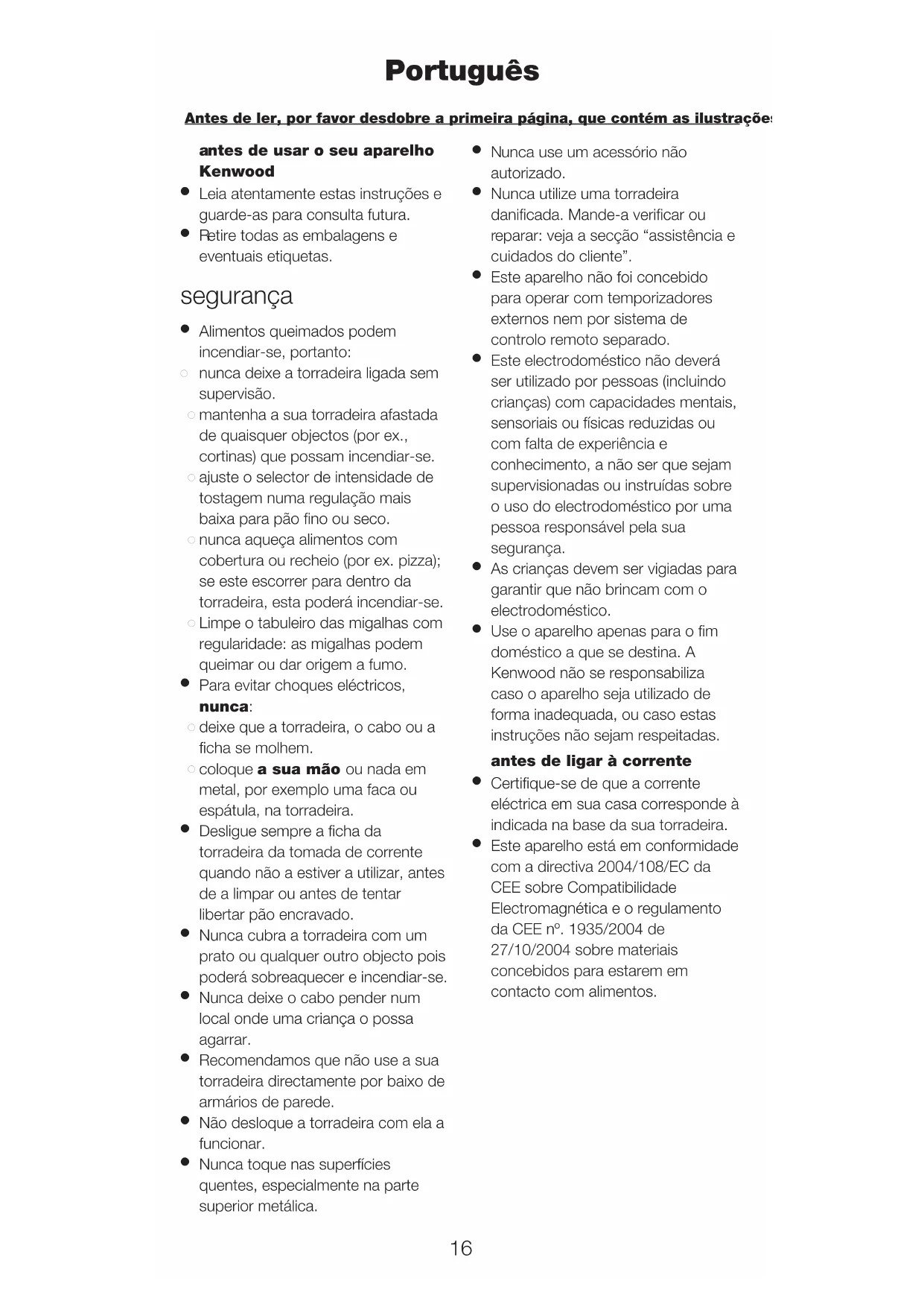Use o aparelho apenas para o fim doméstico a que se destina. A Kenwood não se responsabiliza caso o aparelho seja utilizado de forma inadequada, ou caso estas instruções não sejam respeitadas. antes de ligar à corrente
