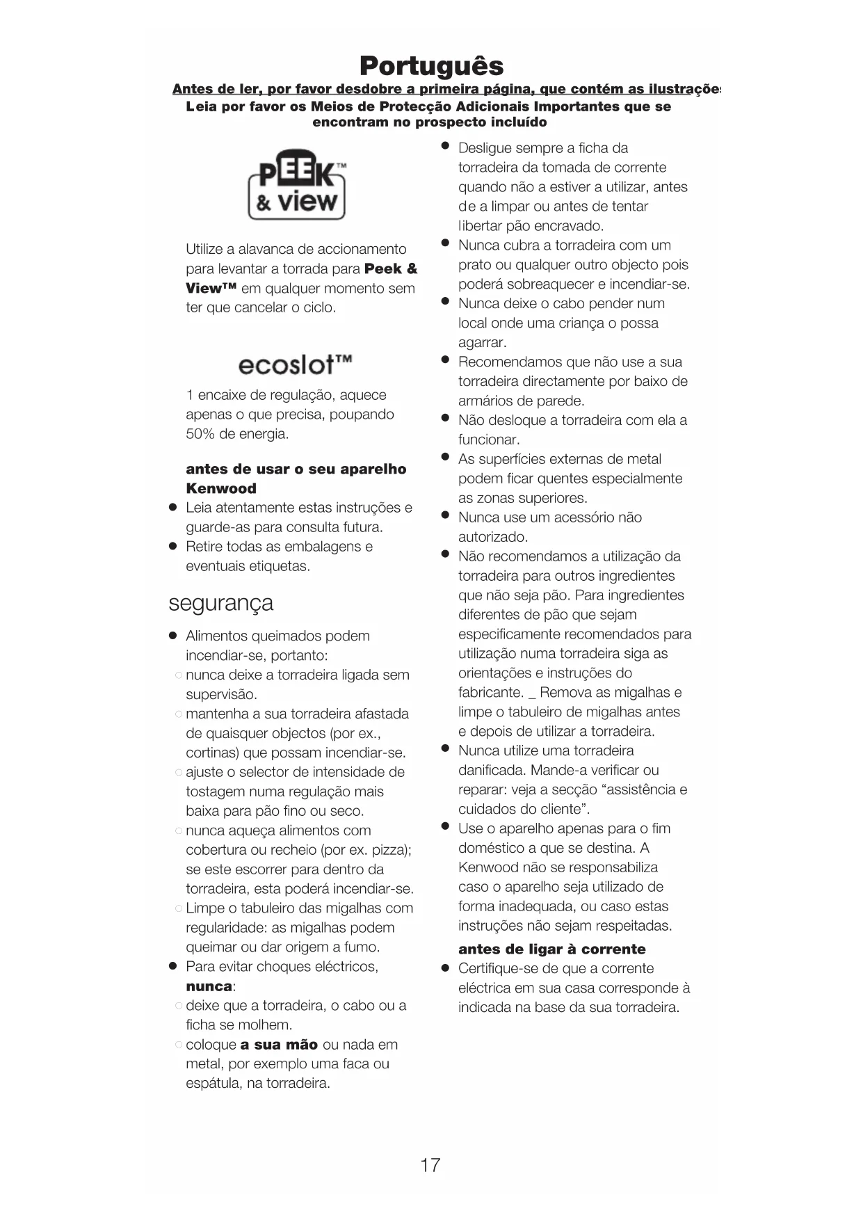 DIRECTIVA EUROPEIA 2002/96/EC. No final da sua vida útil, o produto não deve ser eliminado conjuntamente com os resíduos urbanos. Pode ser depositado nos centros especializados de recolha diferenciada das autoridades locais, ou junto dos revendedores que prestem esse serviço. Eliminar separadamente um electrodomésticos permite evitar as possíveis consequências negativas para o ambiente e para a saúde pública resultantes da sua eliminação inadequada, além de permitir reciclar os materiais componentes, para, assim se obter uma importante economia de energia e de recursos. Para assinalar a obrigação de eliminar os electrodomésticos separadamente, o produto apresenta a marca de um contentor de lixo com uma cruz por cima. 19Use la palanca de elevación para elevar las tostadas a Peek & View™ en cualquier momento sin cancelar el ciclo de tostado. 1 ajuste de la ranura, sólo calienta lo que usted necesita, ahorrando el 50% de energía. antes de utilizar su aparato Kenwood