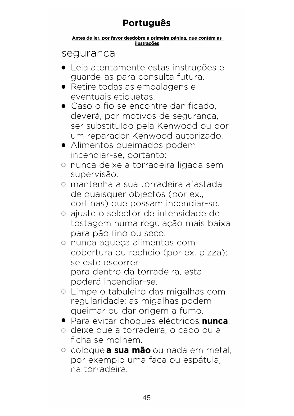 coloque a sua mão ou nada em metal, por exemplo uma faca ou espátula, na torradeira. Antes de ler, por favor desdobre a primeira página, que contém as ilustrações45 46