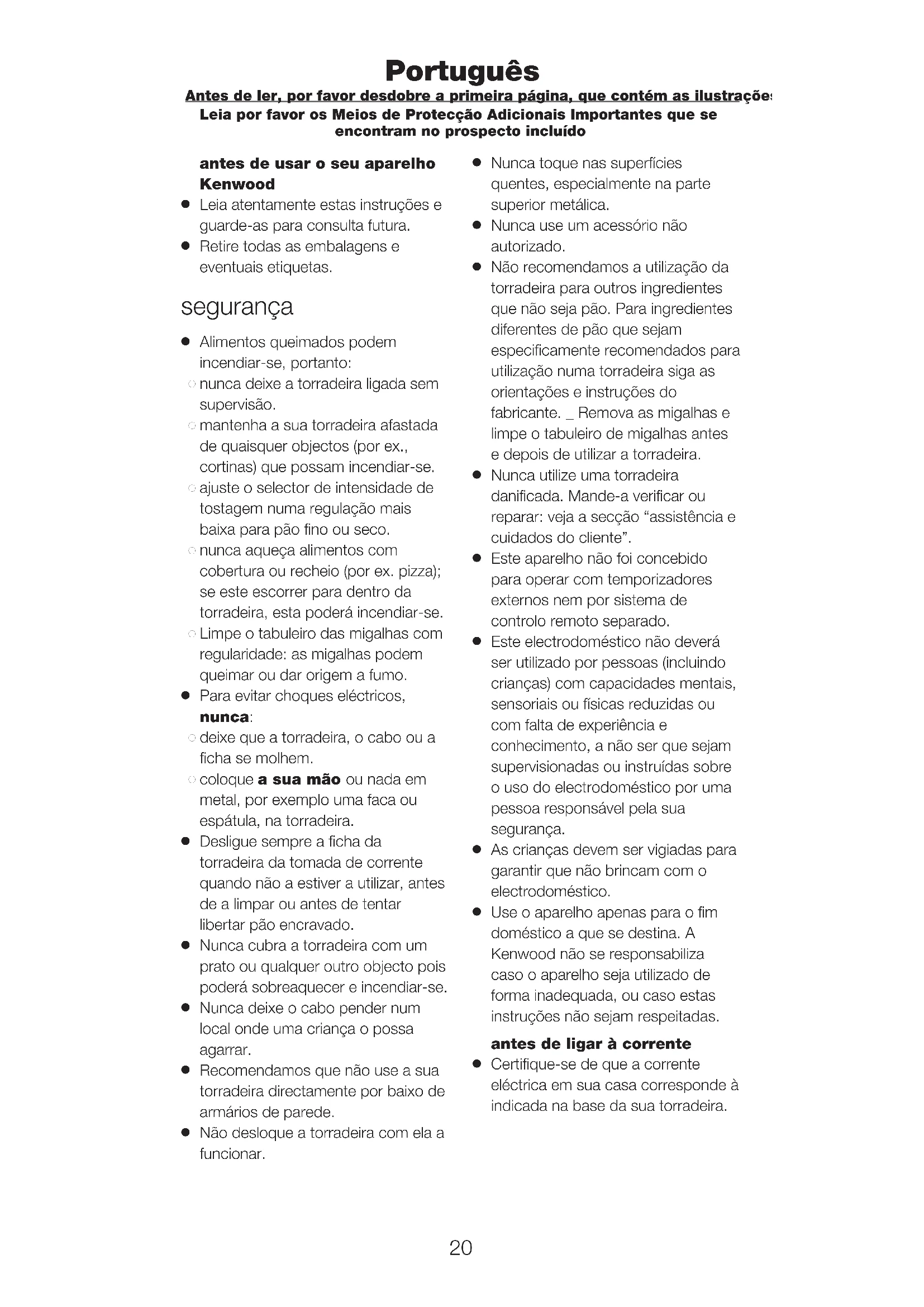 Use o aparelho apenas para o fim doméstico a que se destina. A Kenwood não se responsabiliza caso o aparelho seja utilizado de forma inadequada, ou caso estas instruções não sejam respeitadas. antes de ligar à corrente