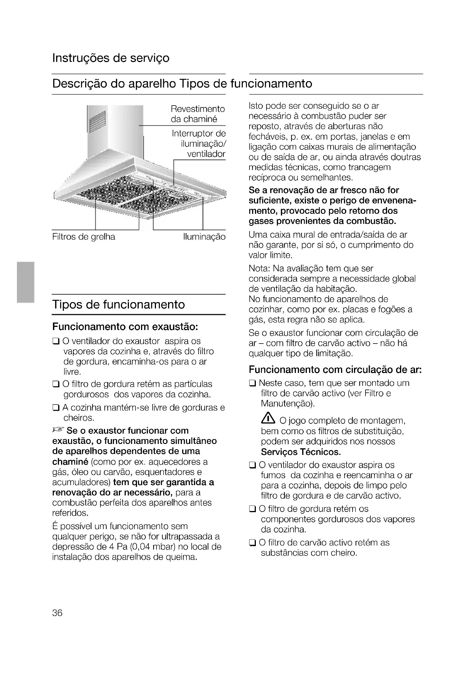 No caso de funcionamento por exaustão e funcionamento simultâneo de zonas de chama dependentes de ligação a uma chaminé (por ex. aquecedores a gás, a óleo ou a carvão; esquentadores, aquecedores de água), tem que ser garantida a ventilação necessária para a combustão perfeita des- ses aparelhos. É possível o funcionamento não perigoso, se a subpressão no local de instalação do aparelho, com funcionamento por combustão, não for superior a 4 Pa (0.04 mbar). Isto pode ser conseguido se o ar necessário à combustão puder ser reposto, através de aberturas não fecháveis, p. ex. em portas, janelas e em ligação com caixas murais de alimentação ou de saída de ar, ou ainda através doutras medidas técnicas, como trancagem recíproca ou semelhantes. Se a renovação de ar fresco não for suficiente, existe o perigo de envenena- mento, provocado pelo retorno dos gases provenientes da combustão. Uma caixa mural de entrada/saída de ar não garante, por si só, o cumprimento do valor limite. Nota: Na apreciação, tem sempre que ser considerada a ventilação global da habitação. No funcionamento de aparel- hos para cozinhar, por ex. placas e fogões, esta regra não é aplicada. Se o exaustor estiver a funcionar com circulação de ar - com filtro de carvão activo - o funcionamento não sofre qualquer limitação.
