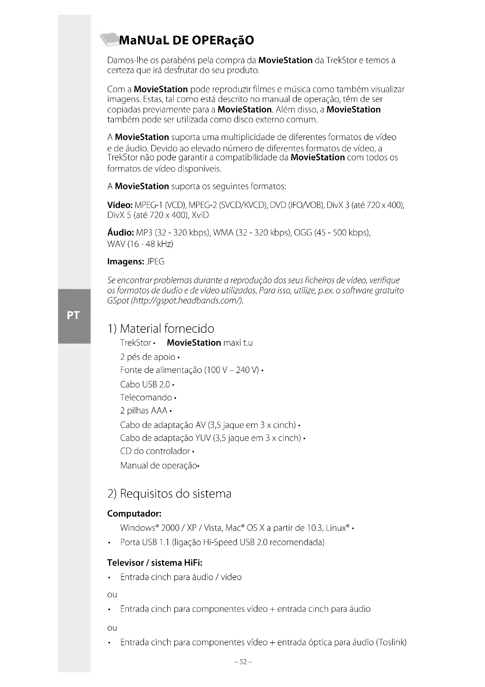 – 53 – MaNUaL DE OPERaçãO Damos-lhe os parabéns pela compra da MovieStation da TrekStor e temos a certeza que irá desfrutar do seu produto. Com a MovieStation pode reproduzir filmes e música como também visualizar imagens. Estas, tal como está descrito no manual de operação, têm de ser copiadas previamente para a MovieStation. Além disso, a MovieStation também pode ser utilizada como disco externo comum. A MovieStation suporta uma multiplicidade de diferentes formatos de vídeo e de áudio. Devido ao elevado número de diferentes formatos de vídeo, a TrekStor não pode garantir a compatibilidade da MovieStation com todos os formatos de vídeo disponíveis. A MovieStation suporta os seguintes formatos: Vídeo: MPEG-1 (VCD), MPEG-2 (SVCD/KVCD), DVD (IFO/VOB), DivX 3 (até 720 x 400), DivX 5 (até 720 x 400), XviD Áudio: MP3 (32 - 320 kbps), WMA (32 - 320 kbps), OGG (45 - 500 kbps), WAV (16 - 48 kHz) Imagens: JPEG Se encontrar problemas durante a reprodução dos seus ficheiros de vídeo, verifique os formatos de áudio e de vídeo utilizados. Para isso, utilize, p.ex. o software gratuito GSpot (http://gspot.headbands.com/).