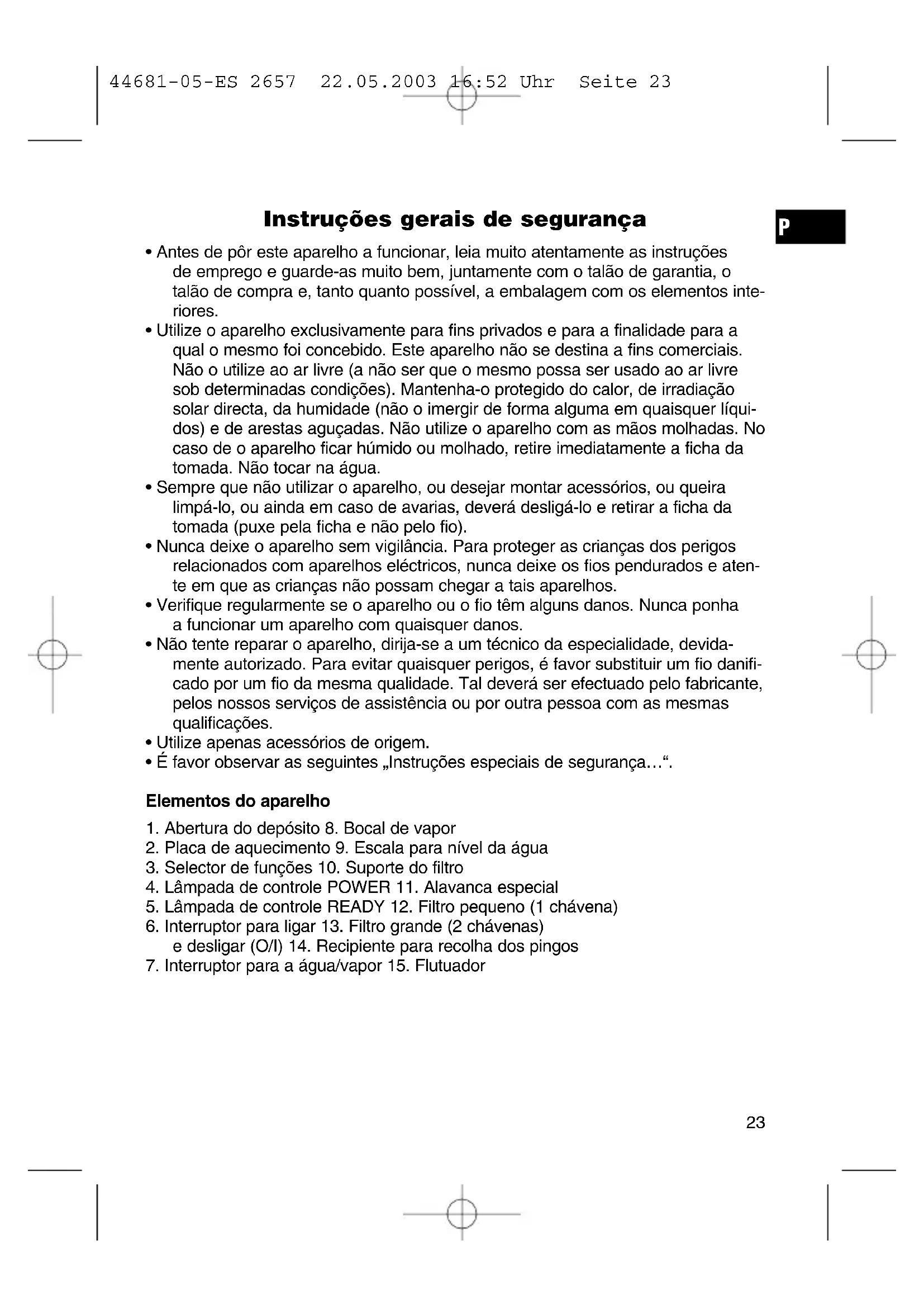 44681-05-ES 2657 22.05.2003 16:52 Uhr Seite 23Antes da primeira utilização Desempacote a máquina com todo o cuidado. Retire todos os acessórios e materi- al de embalagem. Lave os acessórios em água com detergente. Antes de fazer a primeira bica, deixe a máquina trabalhar 2 a 3 vezes apenas com água, a fim de a mesma ficar limpa de quaisquer resíduos. Proceda da forma descrita nos itens 1 a 8 da rubrica “Preparação de bicas”, sem usar café moído. Preparação de bicas