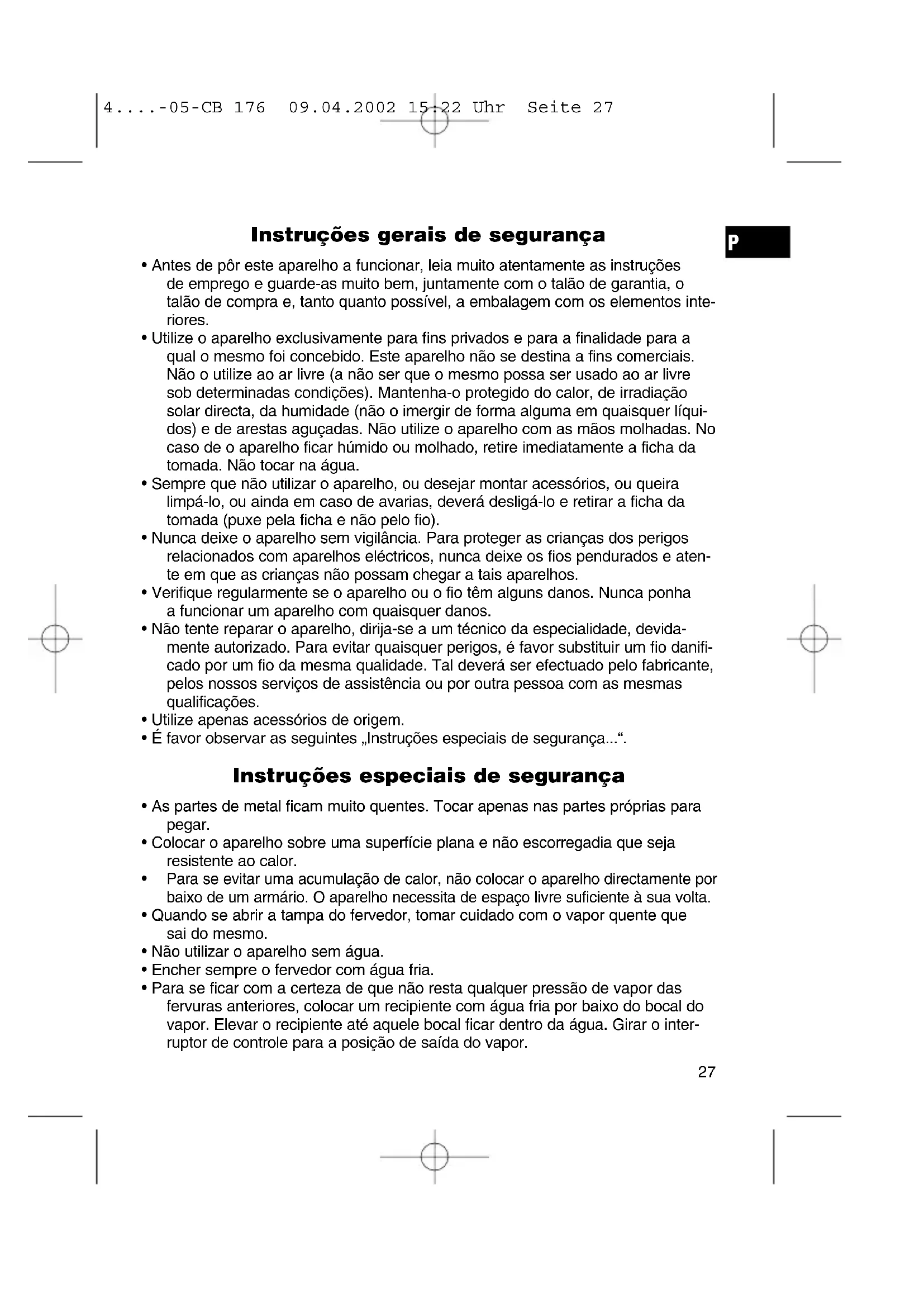4....-05-CB 176 09.04.2002 15:22 Uhr Seite 31No caso de querer fazer valer a garantia, é favor entregar o aparelho completo na embalagem original, juntamente com o talão de compra, na loja onde aquele tenha sido comprado. Em caso de danos em peças de vidro ou de defeitos em quaisquer acessórios, não será efectuada a substituição do aparelho. Os mesmos serão trocados e expe- didos gratuitamente. Não enviar neste caso o aparelho para a fábrica; bastará encomendar o acessório em questão! Não estão incluídas na garantia a limpeza, a manutenção ou a troca de peças que se desgastem, devendo tais despesas ser reembolsadas. A garantia deixará de ter validade, sempre que tenha havido intervenção alheia no aparelho. Após a garantia Após a expiração do prazo de garantia, poderão ser efectuados arranjos por pes- soal especializado, ou pelos nossos serviços de reparações, contra reembolso.