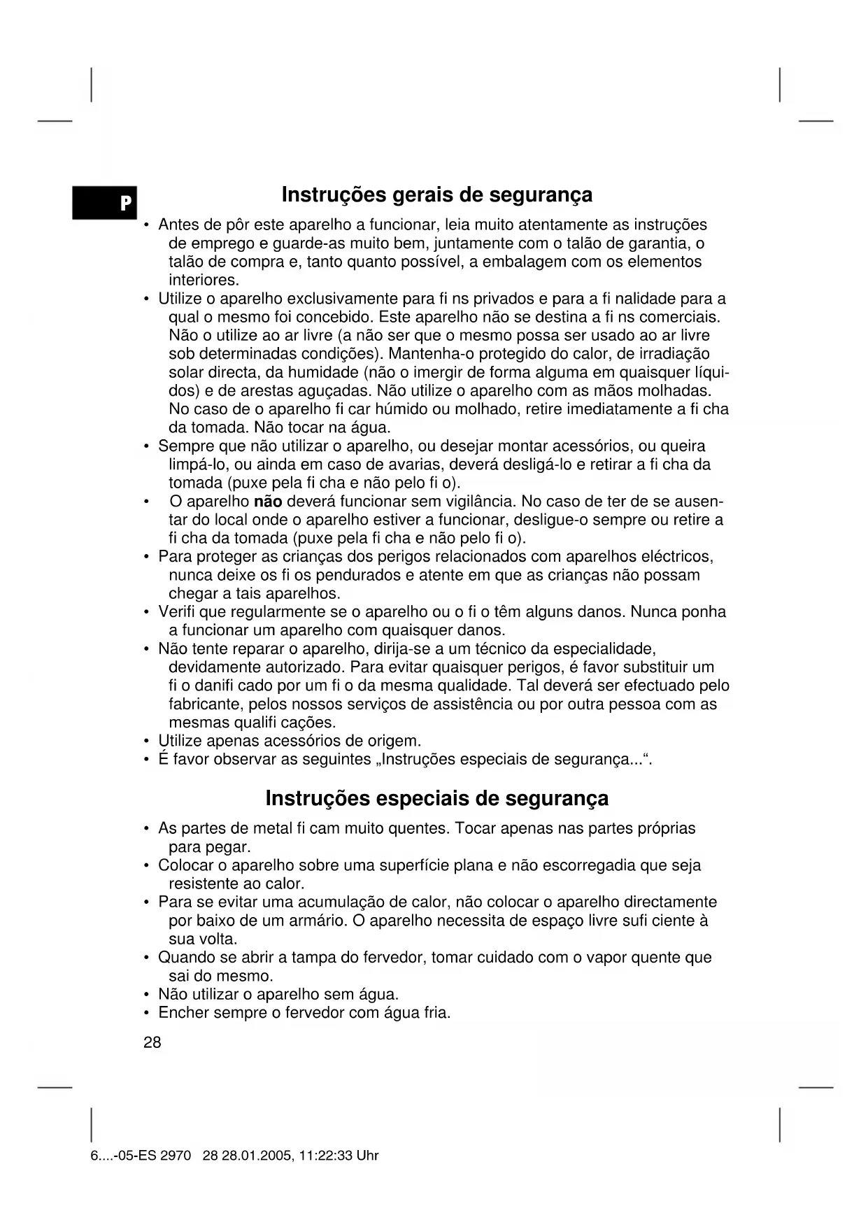 - Untar de vez em quando, com óleo vegetal, a junta da abertura do fervedor e do suporte do fi ltro. Este aparelho foi controlado nos termos das actuais directivas da CEE aplicáveis, tais como inocuidade electromagnética e directiva sobre baixa tensão, e fabricado de acordo com as mais novas prescrições da segurança técnica. Reserva-se o direito de alterações! 6....-05-ES 2970 32 28.01.2005, 11:22:35 UhrP