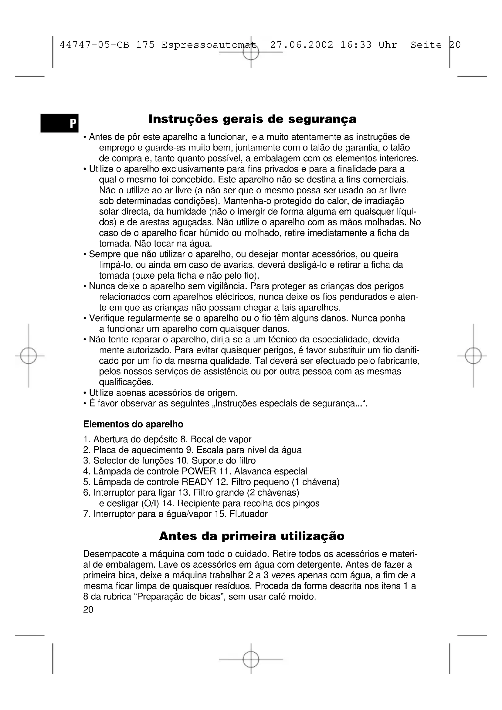 Antes da primeira utilização Desempacote a máquina com todo o cuidado. Retire todos os acessórios e materi- al de embalagem. Lave os acessórios em água com detergente. Antes de fazer a primeira bica, deixe a máquina trabalhar 2 a 3 vezes apenas com água, a fim de a mesma ficar limpa de quaisquer resíduos. Proceda da forma descrita nos itens 1 a 8 da rubrica “Preparação de bicas”, sem usar café moído.
